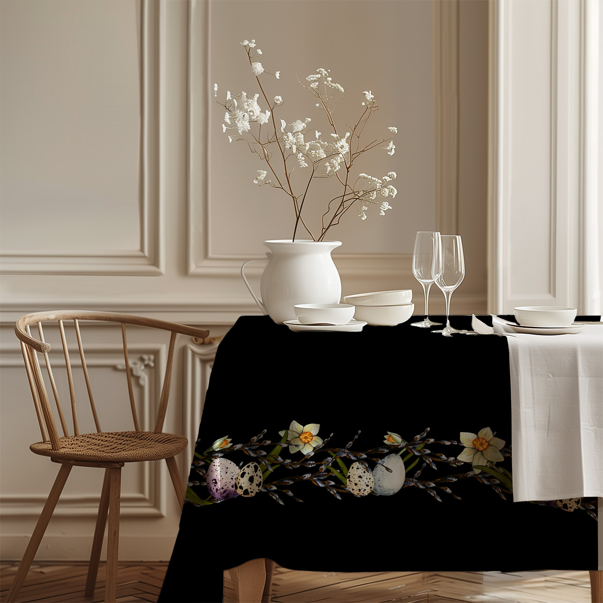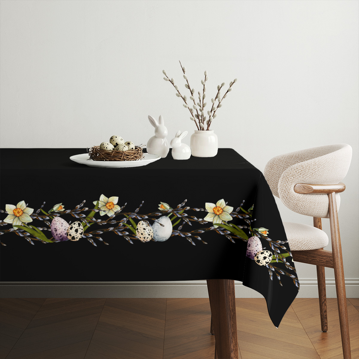 Ten obrus łączy klasyczną czerń tła z malarskim motywem wiosennych żonkili, baziówek i nakrapianych pisanek, tworząc szykowny, a jednocześnie przytulny efekt. Pasek z wzorem delikatnie podkreśla krawędź stołu i przyciąga wzrok, nie dominując nad aranżacją.