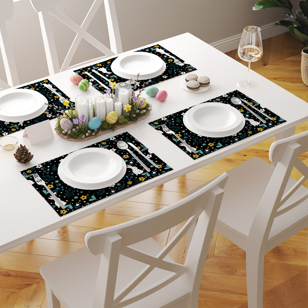 Delikatny wzór z białymi zajączkami, stylizowanymi kwiatami i listkami tworzy elegancką, a jednocześnie radosną kompozycję na czarnym tle. Motyw jest wyraźny i czytelny, co sprawia, że podkładki stają się ozdobą same w sobie.