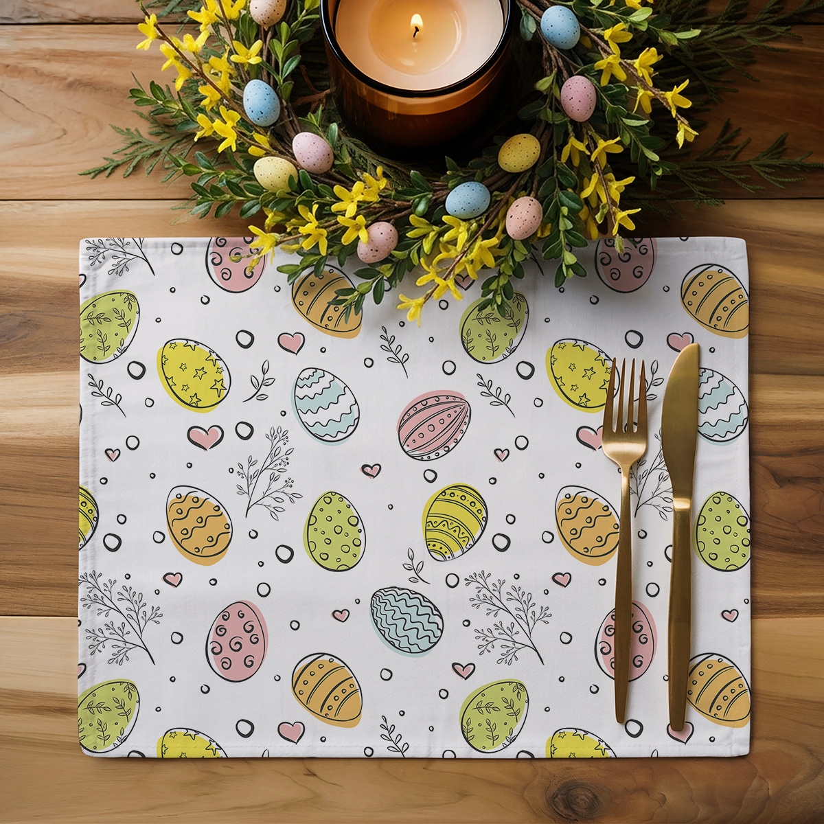Delikatny wzór z pastelowymi pisankami, drobnymi serduszkami i cienkimi gałązkami tworzy subtelną, wiosenną kompozycję, która ozdobi każdy stół. Białe tło podkreśla kolorowe akcenty, nadając aranżacji świeży i lekki charakter. Na zdjęciach widać, jak wzór komponuje się zarówno z naturalnymi elementami dekoracyjnymi, jak i prostą zastawą stołową. Motyw dobrze sprawdza się w aranżacjach z drewnianym blatem i świątecznymi dekoracjami, tworząc przytulną atmosferę. Zestaw dwóch sztuk to praktyczne rozwiązanie na świąteczne śniadanie, rodzinne obiady czy codzienne kawowe chwile. Podkładki wprowadzają radosny akcent bez przytłaczania pozostałych dekoracji. Dzięki subtelnej palecie kolorów łatwo je łączyć z innymi elementami stołu, a nadrukowany wzór dodaje uroku każdej aranżacji. To prosty sposób, by szybko odmienić wygląd stołu na wielkanocne spotkania w rodzinnym gronie.