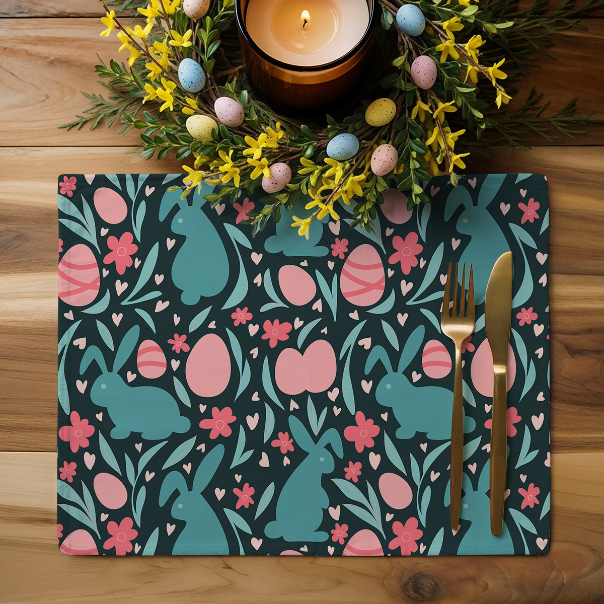 Pierwszy akapit opisuje urok dekoracyjnego wzoru: drobne zajączki, pisanki i kwiatowe akcenty tworzą radosny, wiosenny motyw w stonowanej, a jednocześnie wyrazistej kolorystyce. Wzór dobrze sprawdzi się jako centralny punkt aranżacji stołu na święta lub do codziennego podkreślenia wiosennego nastroju. Podkładki ustawione pod talerzami pełnią praktyczną funkcję — zabezpieczają blat przed zabrudzeniami i dodają estetyki przy serwowaniu posiłków. Dzięki neutralnej palecie kolorów łatwo je łączyć z naczyniami i dekoracjami, tworząc spójną kompozycję stołu. Produkt zaprojektowano z myślą o codziennym użytkowaniu; wzór pozostaje czytelny i intensywny, co sprawia, że podkładki prezentują się atrakcyjnie nawet przy częstym użytkowaniu. Łatwo utrzymać je w czystości, a po złożeniu zajmują niewiele miejsca, co ułatwia przechowywanie poza sezonem. Aby uzyskać spójny efekt dekoracyjny, polecamy łączenie z naturalnymi dodatkami takimi jak drewniane elementy, świeże kwiaty czy pastelowe pisanki — w ten sposób stół nabierze przytulnego i świątecznego charakteru.