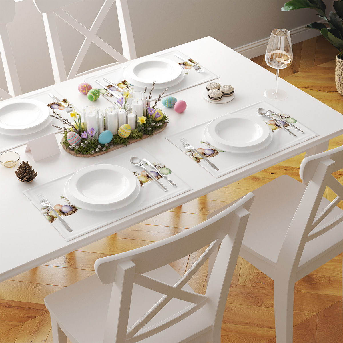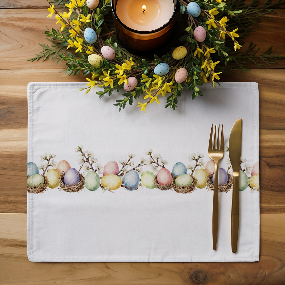 Świąteczny akcent na każdym nakryciu stołu dzięki delikatnym, pastelowym pisankom i kwitnącym gałązkom. Podkładki są praktyczne i eleganckie, idealne na rodzinne świąteczne spotkania.