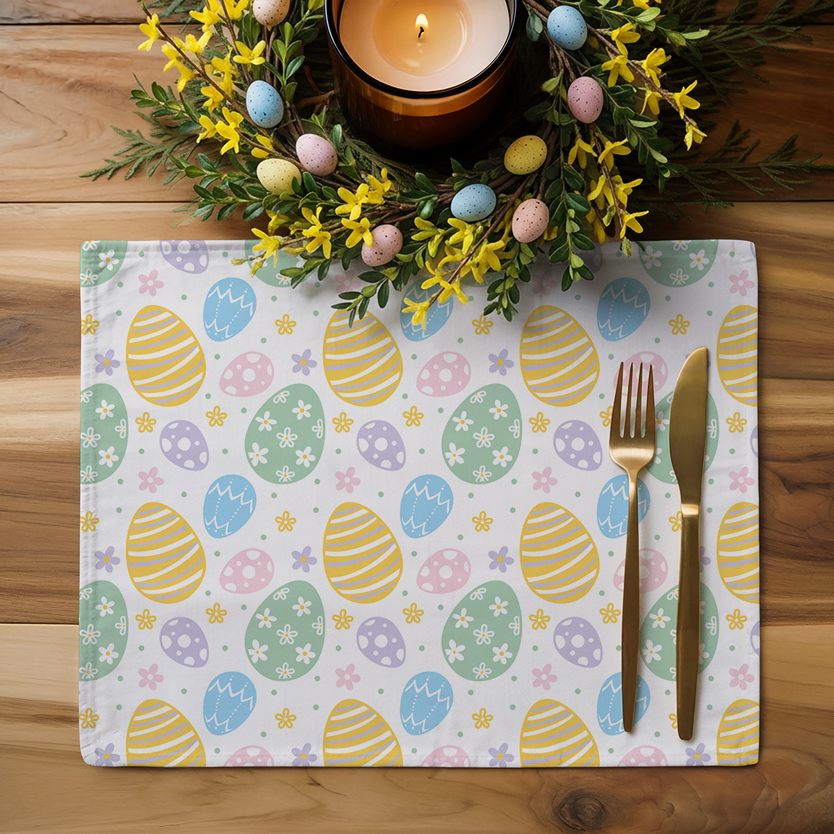 Wesoły, świąteczny wzór łączy delikatne, pastelowe pisanki z drobnymi kwiatkami, tworząc lekki i radosny motyw. Białe tło podkreśla kolory i sprawia, że podkładki pasują do różnych dekoracji stołu.