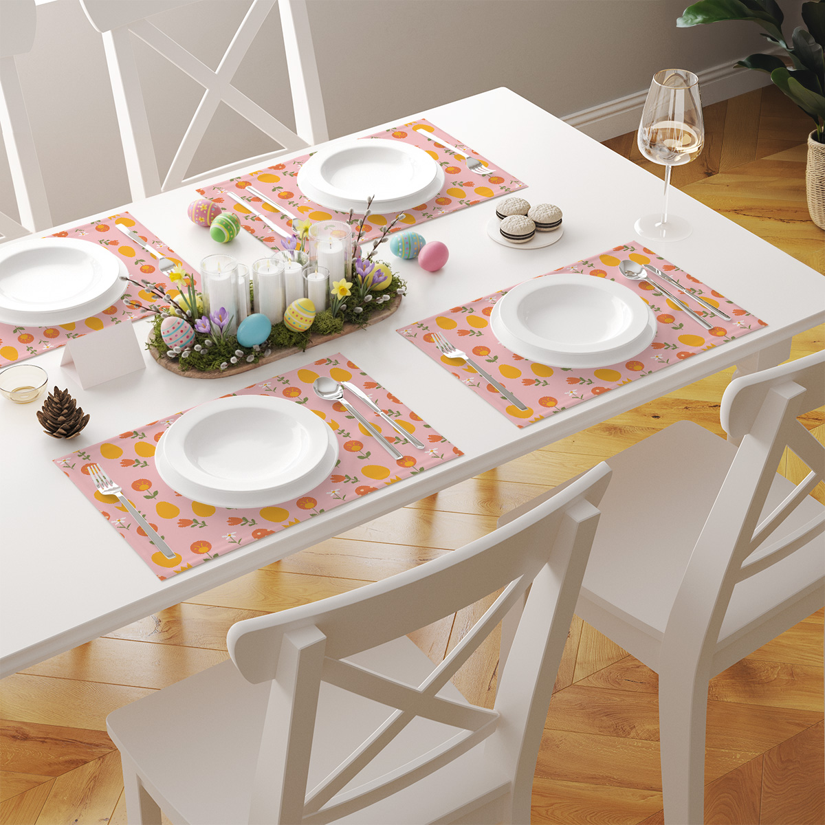 Pastelowy wzór z pisankami i drobnymi kwiatami wnosi radosny, wiosenny akcent na stół. Zestaw dwóch podkładek świetnie uzupełni świąteczną aranżację i codzienne posiłki.