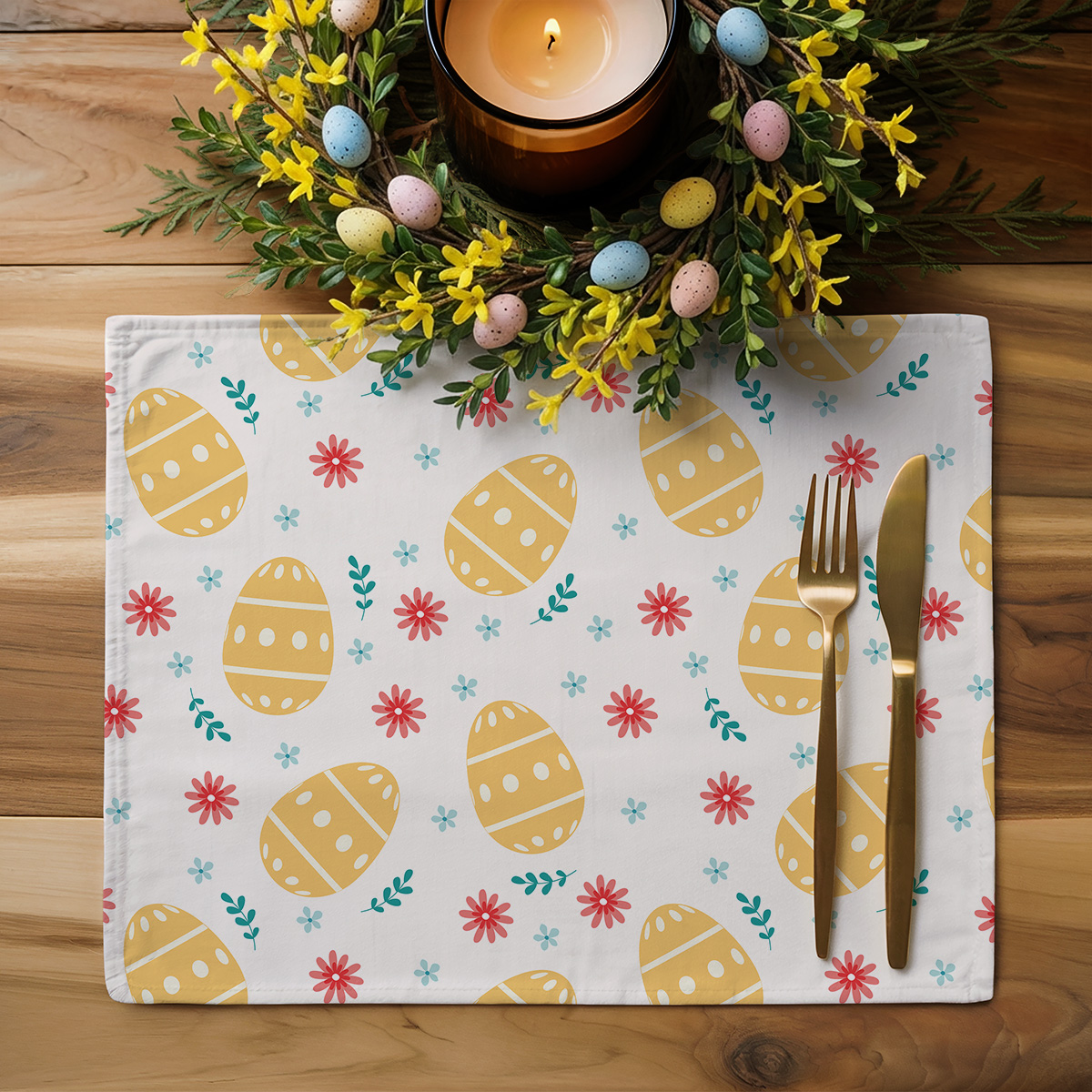Wesoły komplet dwóch podkładek z motywem pisanek i delikatnymi wiosennymi kwiatami rozświetli wielkanocny stół. Dzięki uniwersalnemu wzorowi idealnie sprawdzą się podczas rodzinnych spotkań i codziennych posiłków.