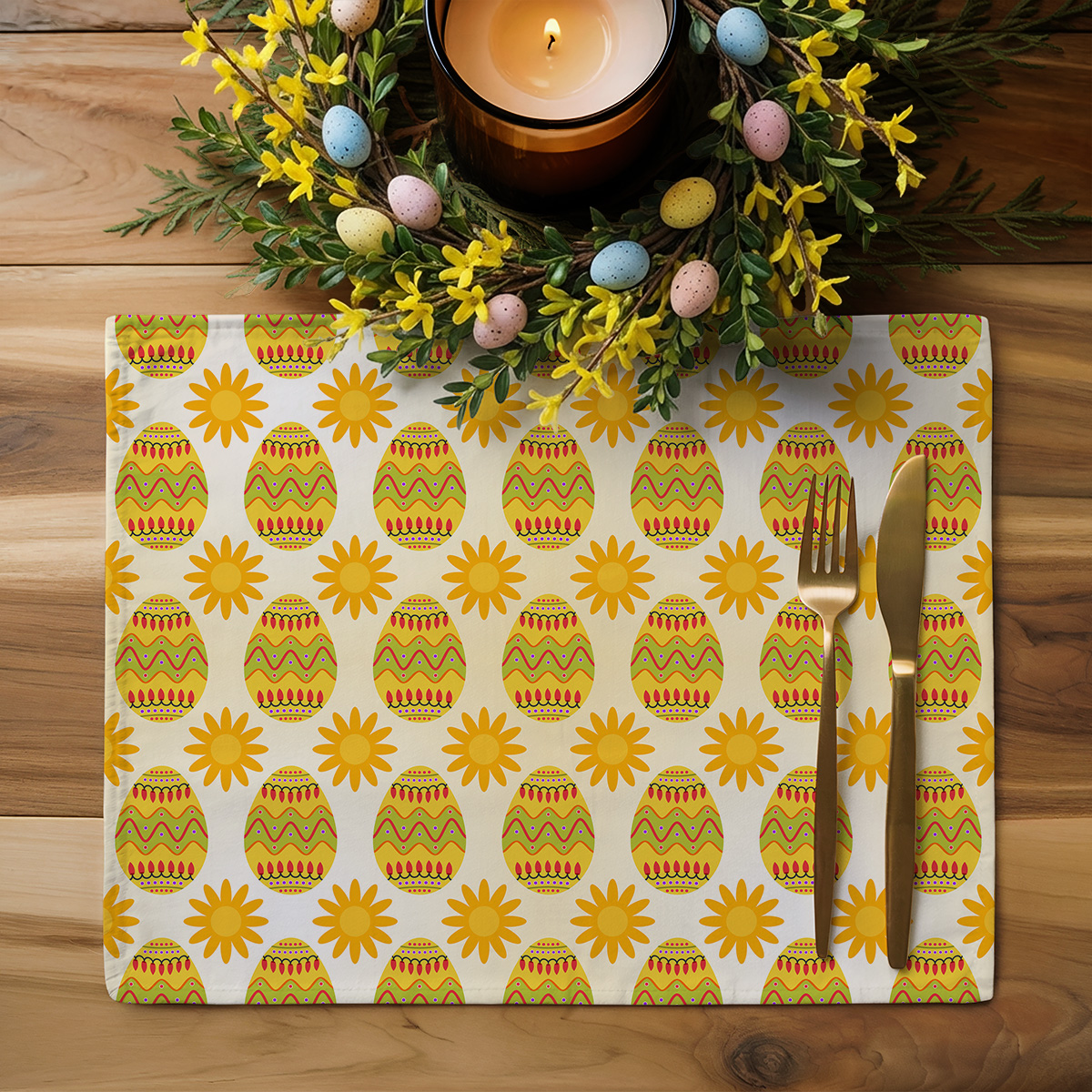 Radosny, powtarzalny wzór przedstawia żółto-pomarańczowe słoneczka przeplatane dekoracyjnymi pisankami w odcieniach żółci, zieleni i czerwieni. Intensywne barwy i prosty, regularny układ nadają stołowi wiosennego, uśmiechniętego charakteru.