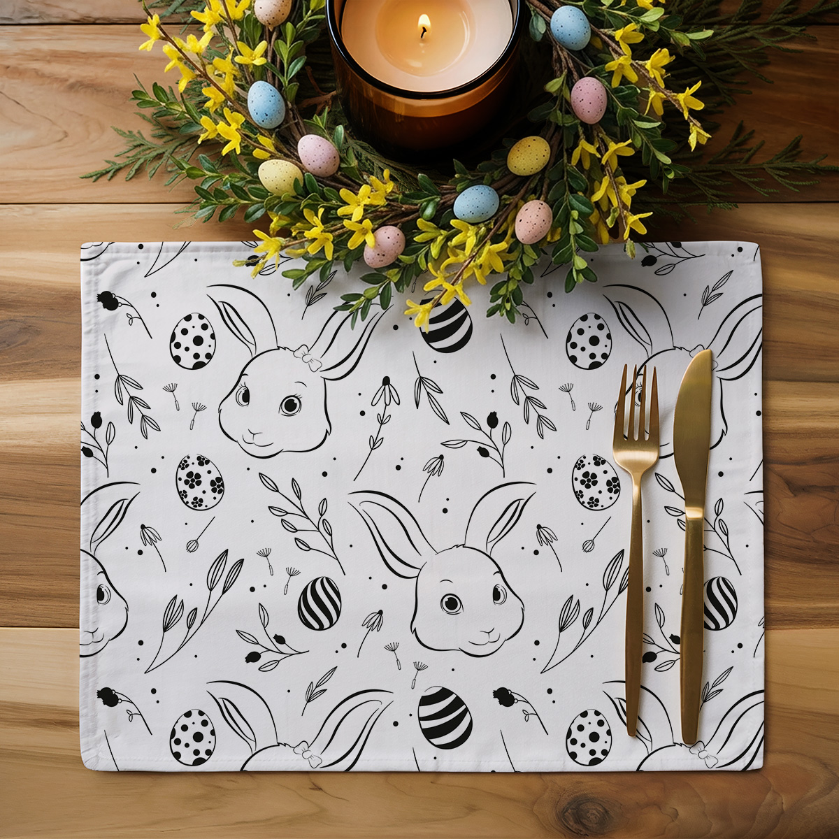 Zestaw dwóch podkładek z delikatnym, czarno-białym wzorem króliczków i pisanek. Idealne do świątecznego nakrycia stołu, wprowadzają lekki i elegancki akcent.
