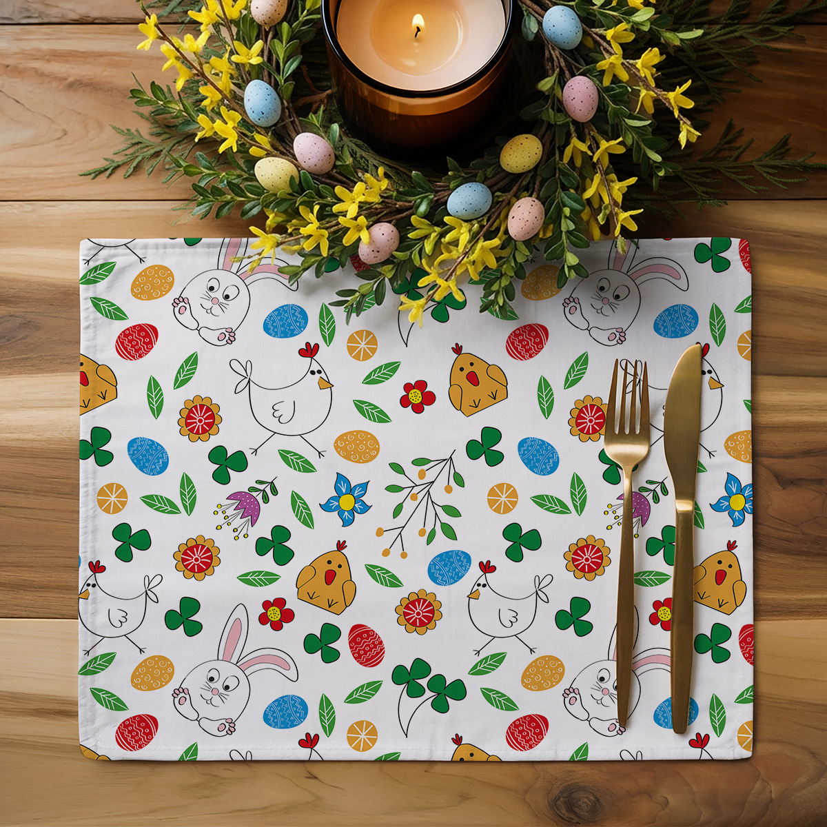 Uroczy komplet dwóch podkładek z wesołym, kolorowym wzorem króliczków, piskląt i pisanek. Dodają świątecznego charakteru i wprowadzają radosny akcent na wielkanocny stół.