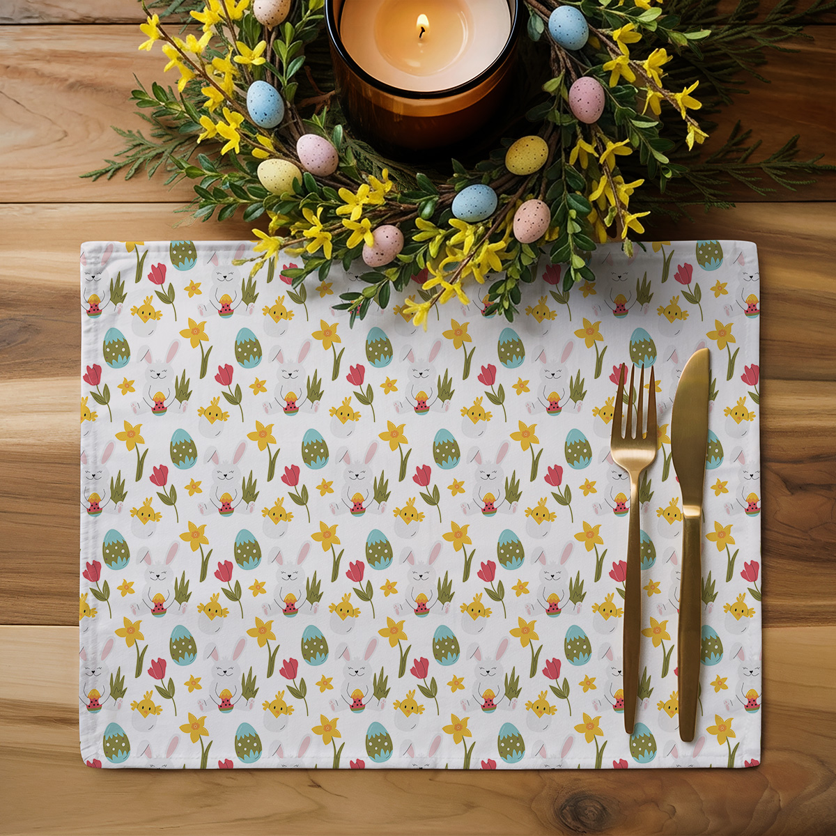 Uroczy komplet dwóch podkładek z wielkanocnym wzorem z zajączkami, pisankami i wiosennymi kwiatami. Dodają świątecznego charakteru stołowi i tworzą radosną atmosferę podczas rodzinnych posiłków.