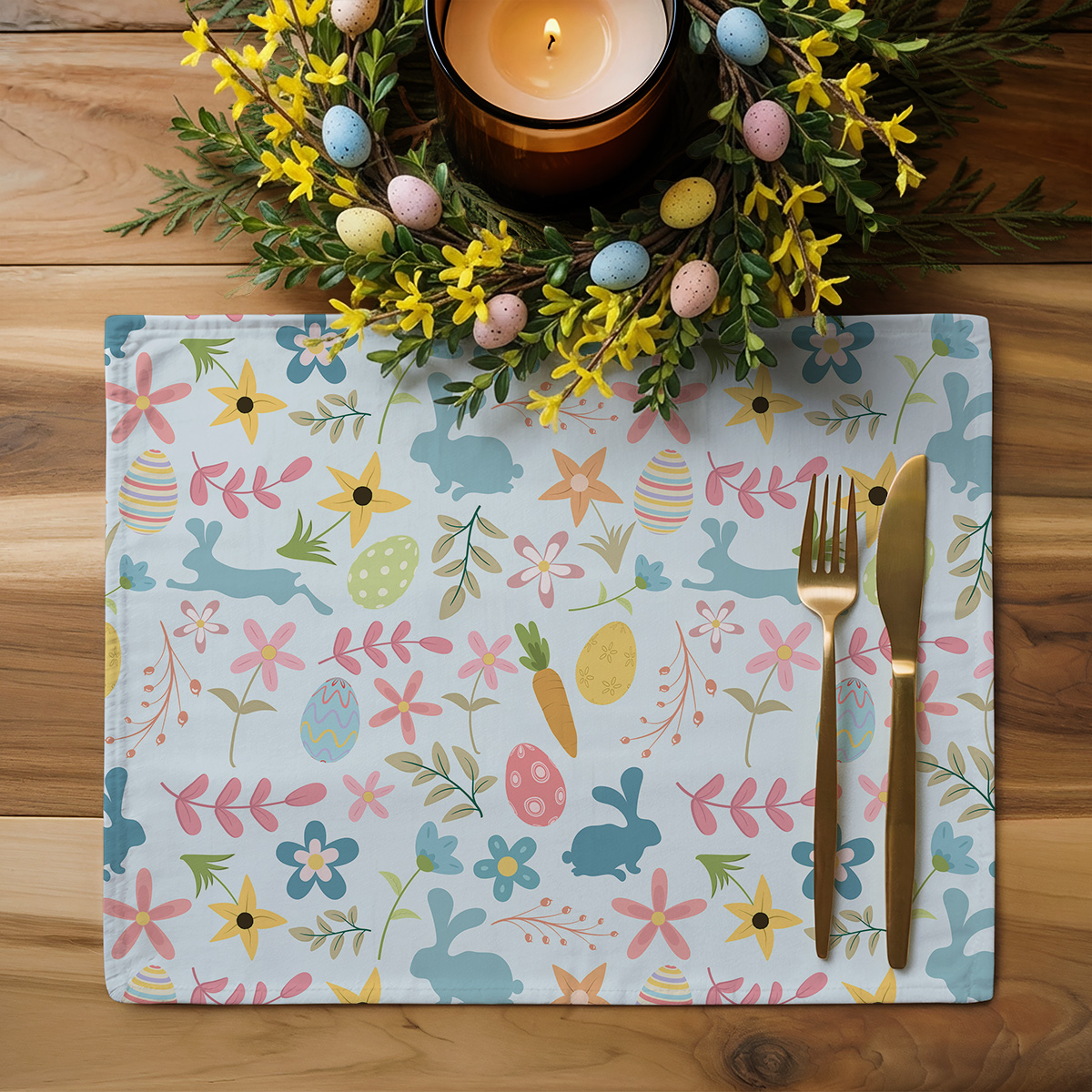 Delikatna, pastelowa kolorystyka i radosne motywy zajączków, pisanek oraz kwiatów tworzą przyjemny, świąteczny wzór, który ozdobi każdy stół. Projekt jest lekki i wesoły, idealny do wiosennych aranżacji. Wzory rozmieszczone są w sposób przyjazny dla oka: sylwetki zajączków przeplatają się z dekoracyjnymi jajkami i drobnymi kwiatami, co nadaje całości rodzinnego charakteru. Dzięki uniwersalnemu stylowi podkładki pasują zarówno do nowoczesnych, jak i tradycyjnych zastaw. Użycie pastelowych tonów sprawia, że dekoracja nie przytłacza, a jednocześnie dodaje stołowi przytulności i świątecznego klimatu. To praktyczny sposób na szybką metamorfozę stołu przed świętami. Zestaw dwuelementowy jest świetnym uzupełnieniem wielkanocnych dekoracji i prostym sposobem na subtelne odświeżenie aranżacji. Podkładki mogą też stać się drobnym, miłym upominkiem dla bliskich, którzy lubią tematyczne dodatki do domu.