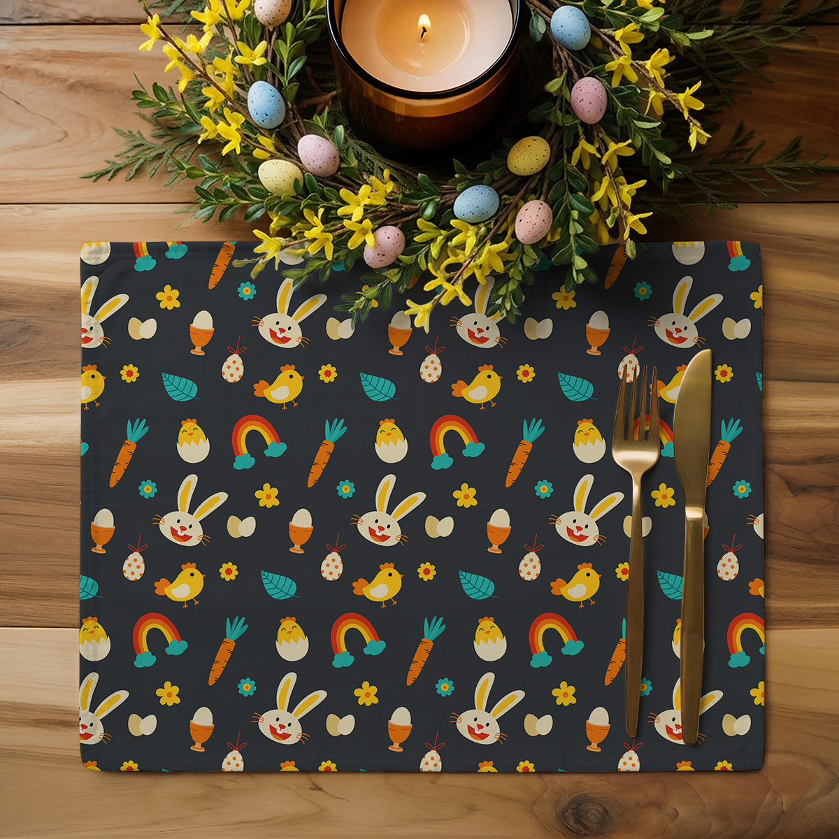 Wzór łączy radosne, kolorowe elementy — króliczki, kurczątka, jajka, marchewki i tęcze — na spokojnym, ciemnym tle, dzięki czemu dekoracja jest jednocześnie zabawna i elegancka. Powtarzalny motyw tworzy spójną kompozycję, która dobrze prezentuje się w domowym, świątecznym wnętrzu.