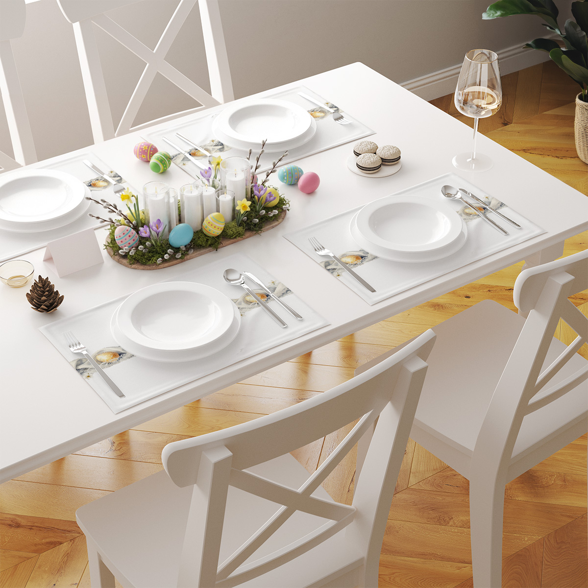 Delikatny motyw akwarelowych pisanek ułożonych w koronkową girlandę ozdabia białe podkładki, tworząc subtelny i elegancki akcent na świątecznym stole. Pastelowe barwy i finezyjne detale koronki podkreślają uroczysty charakter nakrycia i pasują zarówno do klasycznych, jak i nowoczesnych aranżacji.