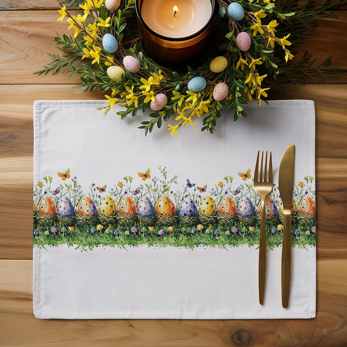 Świąteczny komplet podkładek z akwarelową grafiką pisankowego ogródka i motyli. Tkanina jest plamoodporna i łatwa do czyszczenia, dzięki czemu dekoracja stołu zachowa świeży wygląd przez długi czas.