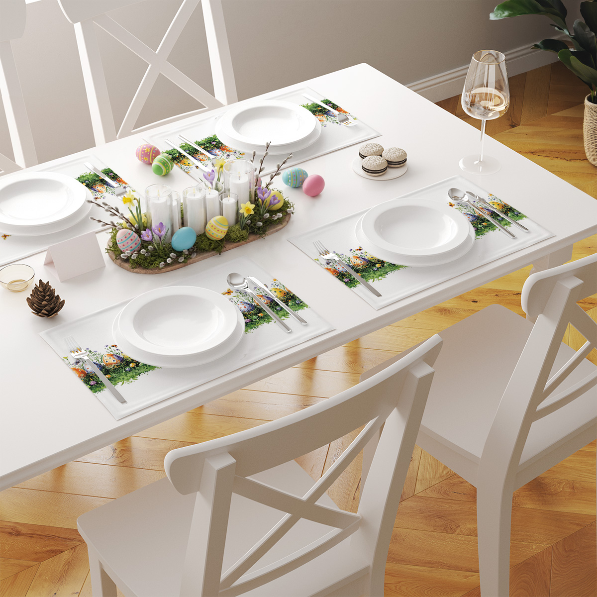 Ustawione na świątecznym stole tworzą wesołą, a zarazem elegancką oprawę dla porannego śniadania czy rodzinnego obiadu; łatwo je łączyć z bieżnikiem i naturalnymi dekoracjami. Dzięki żywym kolorom pisanek i subtelnej grafice podkładki ożywią każdą aranżację świąteczną i dodadzą stołowi radosnego charakteru.