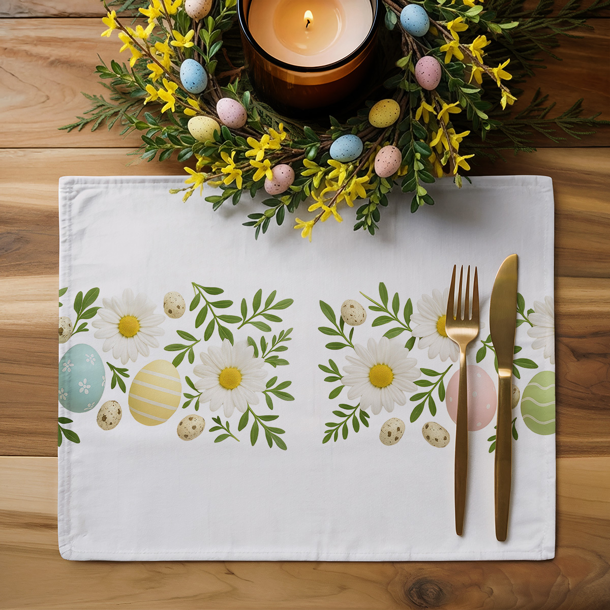Delikatny wzór stokrotek i pastelowych pisanek wnosi wiosenny nastrój na każdy świąteczny stół. Podkładki są praktyczne i łatwe w utrzymaniu czystości, idealne do rodzinnych spotkań.