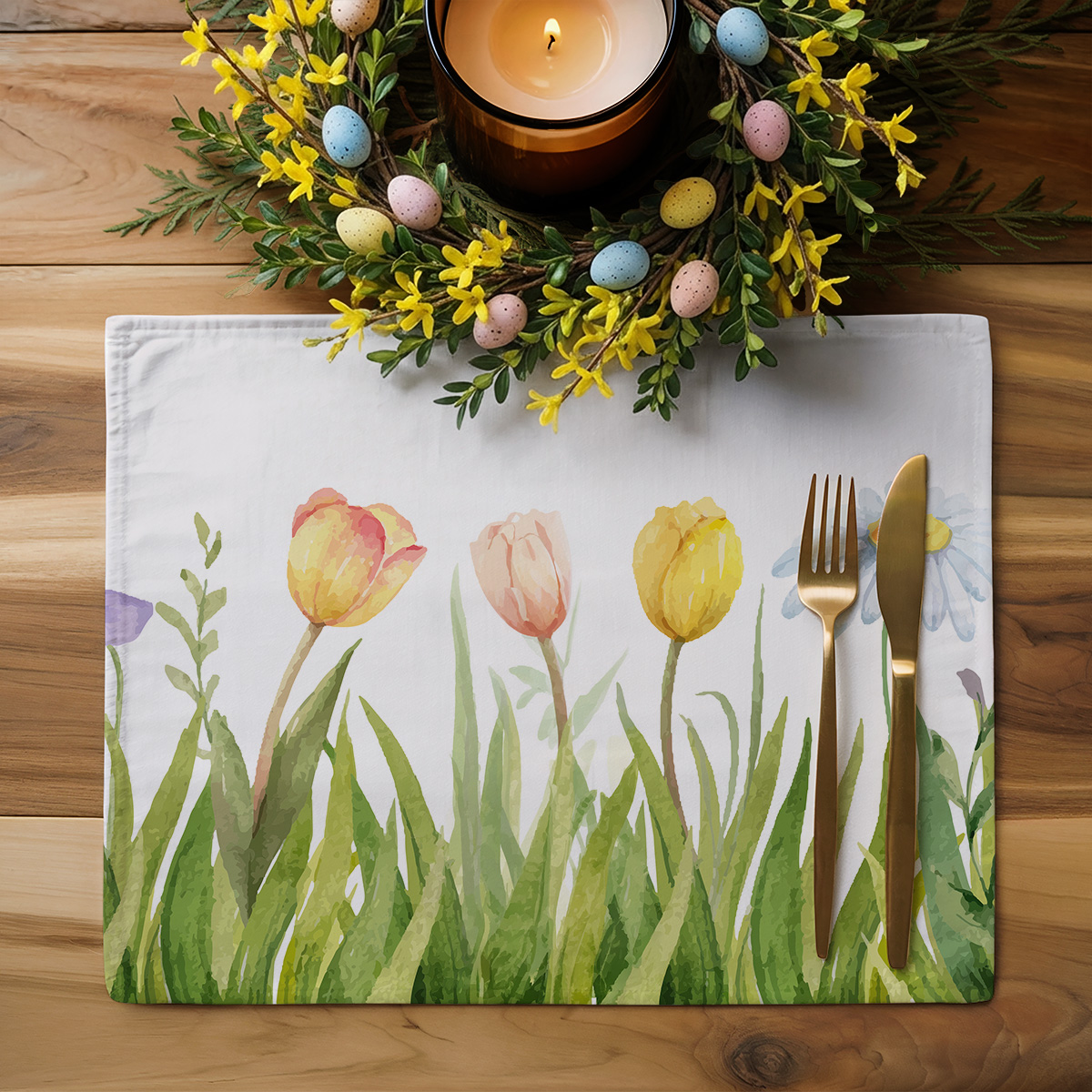 Delikatny wzór łąki z tulipanami i stokrotkami wprowadzi wiosenną świeżość na stół. Podkładki są praktyczne w użyciu i łatwe w pielęgnacji, idealne do świątecznego nakrycia.