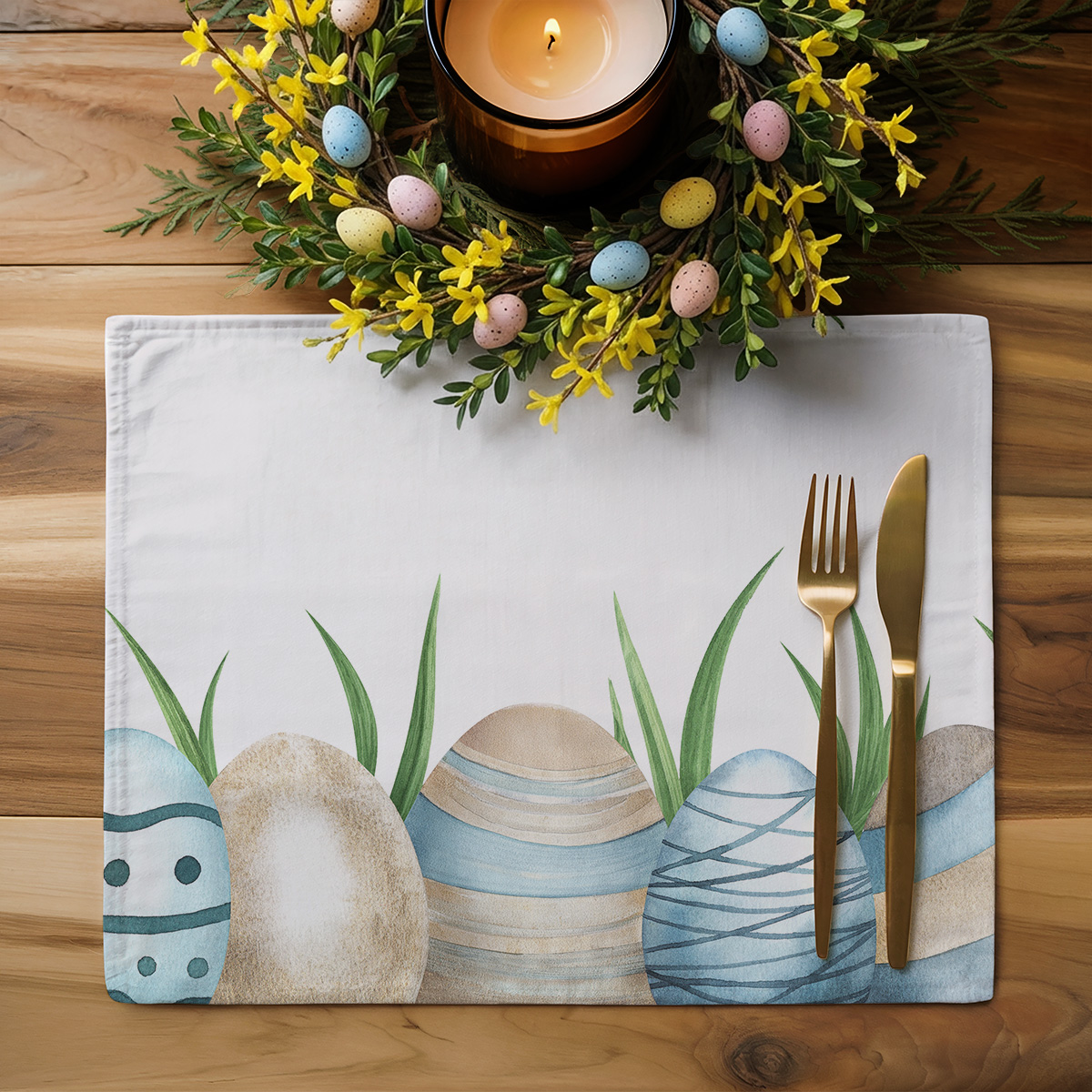 Subtelne akwarelowe pisanki w odcieniach błękitu i beżu, otoczone smukłymi źdźbłami trawy, tworzą lekki i harmonijny wzór przy brzegu podkładki. Jasne tło podkreśla pastelową paletę kolorów i nadaje całości świeżego, wiosennego charakteru.
