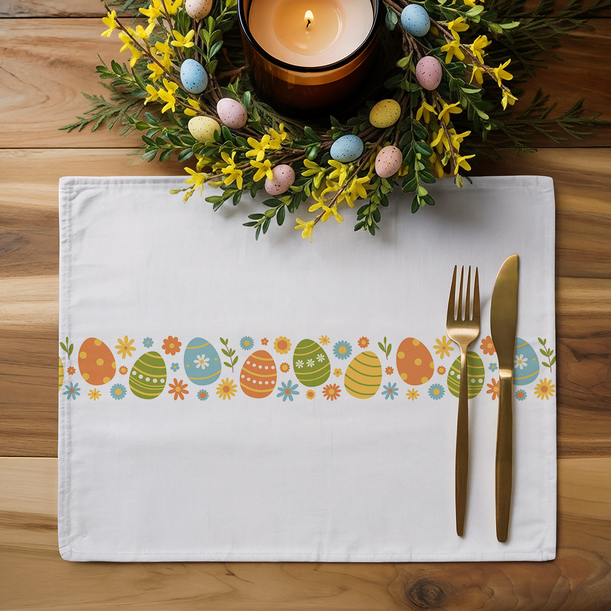 Pierwszy plan zajmuje uroczy, poziomy pas z ozdobnymi pisankami i małymi kwiatkami w ciepłych, wiosennych barwach na jasnym tle, który dodaje aranżacji lekkości i świątecznego charakteru. Wzór jest przyjazny i delikatny, idealny do rodzinnych śniadań oraz przyjęć wielkanocnych.