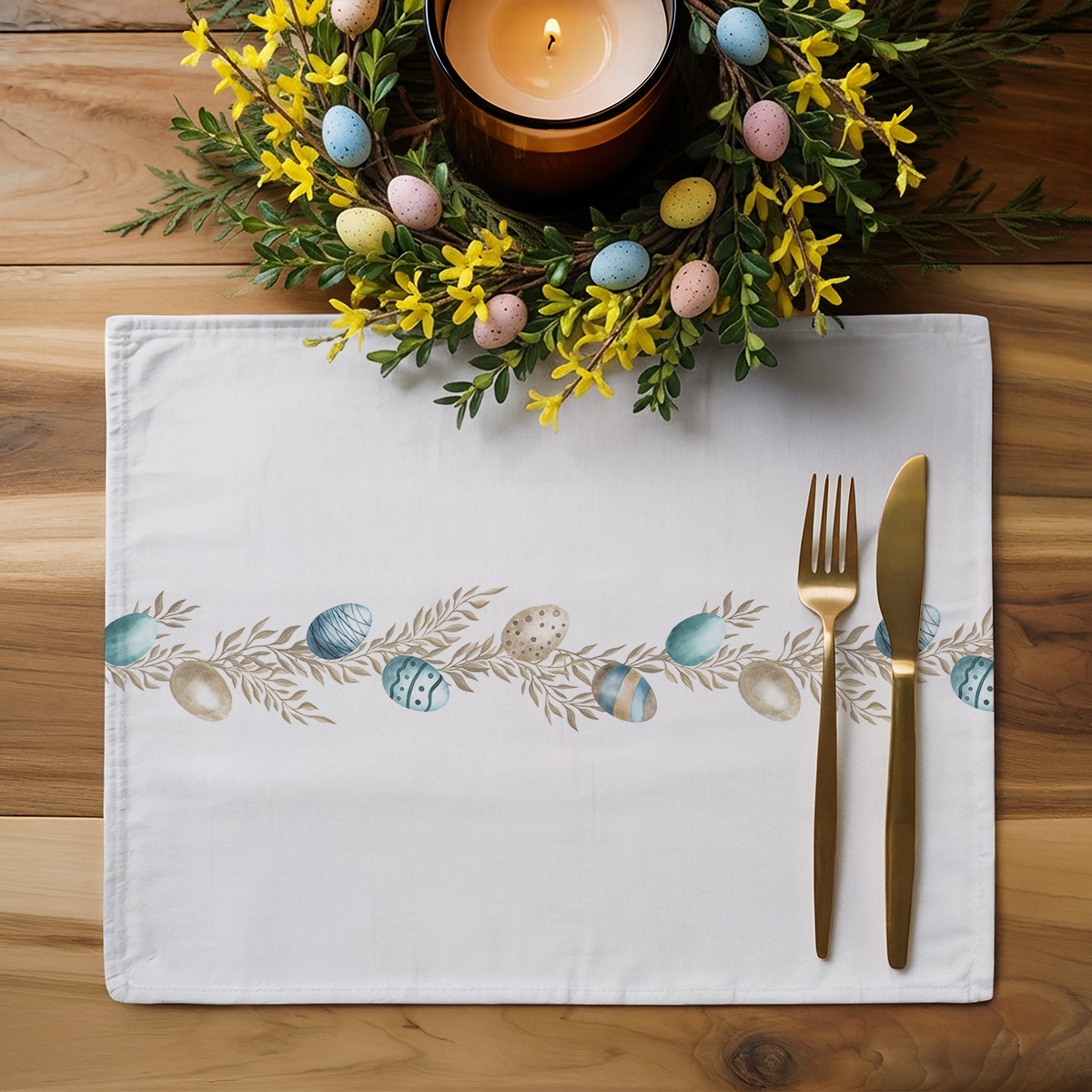 Subtelny wzór z malowanymi pisankami i delikatnymi beżowymi gałązkami w pastelowych odcieniach tworzy elegancką, a zarazem przytulną oprawę stołu. Kompozycja utrzymana w stonowanej palecie wprowadza wiosenny nastrój bez krzykliwych akcentów. Wykonane z gładkiej, łatwej w pielęgnacji tkaniny, podkładki są praktyczne w codziennym użyciu i proste w czyszczeniu, co sprawdza się podczas świątecznych spotkań z rodziną.