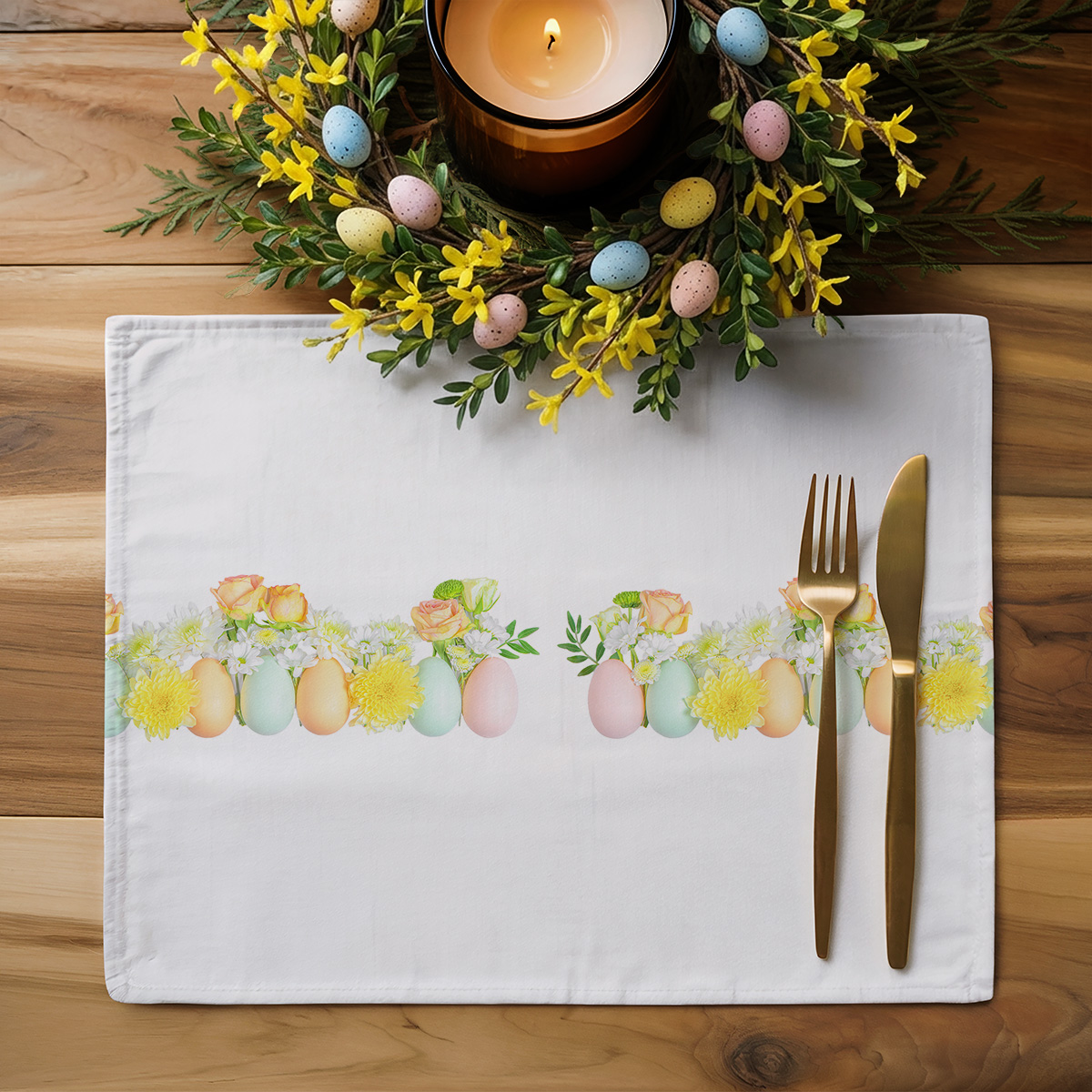 Delikatne podkładki ozdobione paskiem pastelowych jajek i wiosennych kwiatów wniosą do stołu subtelny, świąteczny nastrój. Są praktyczne, łatwe w czyszczeniu i świetnie komponują się z jasną zastawą.