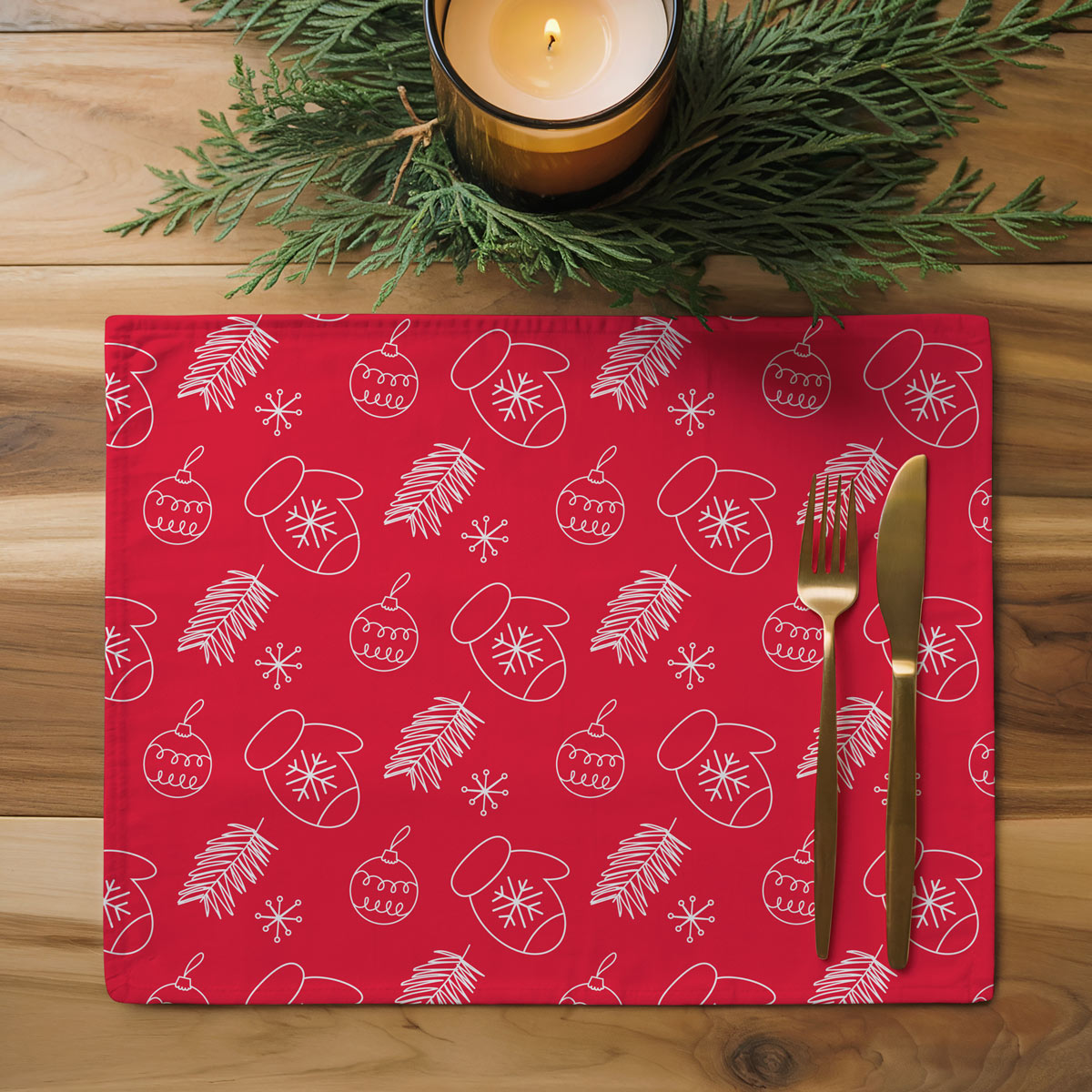 Stylowa podkładka świąteczna w czerwonym kolorze z białymi rękawiczkami, bombkami i gałązkami. Dodaje uroku nakryciu stołu i idealnie sprawdza się w okresie zimowym.