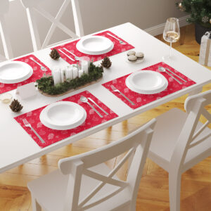 Świąteczna podkładka stołowa w intensywnym czerwonym kolorze to idealny sposób, aby dodać aranżacji ciepła i radosnego charakteru. Białe rękawiczki, dekoracyjne bombki i gałązki tworzą przyjemny, zimowy wzór, który świetnie komponuje się z jasną zastawą.