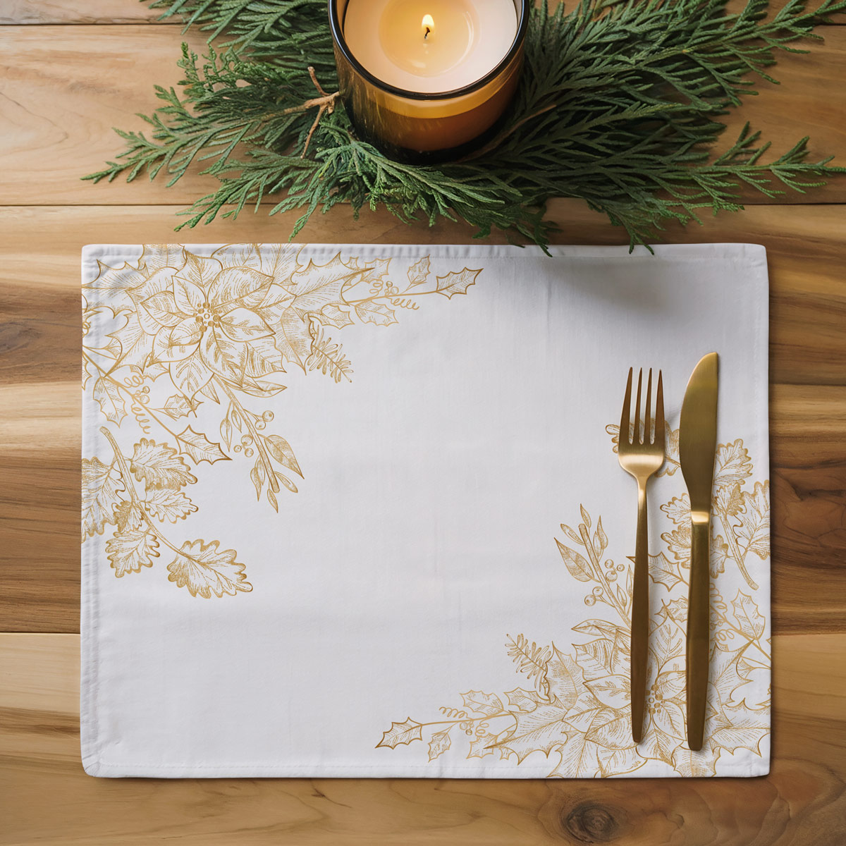 Elegancka podkładka na stół z delikatnym złotym motywem roślinnym. Minimalistyczny, świąteczny akcent, który doda klasy każdej aranżacji stołu.