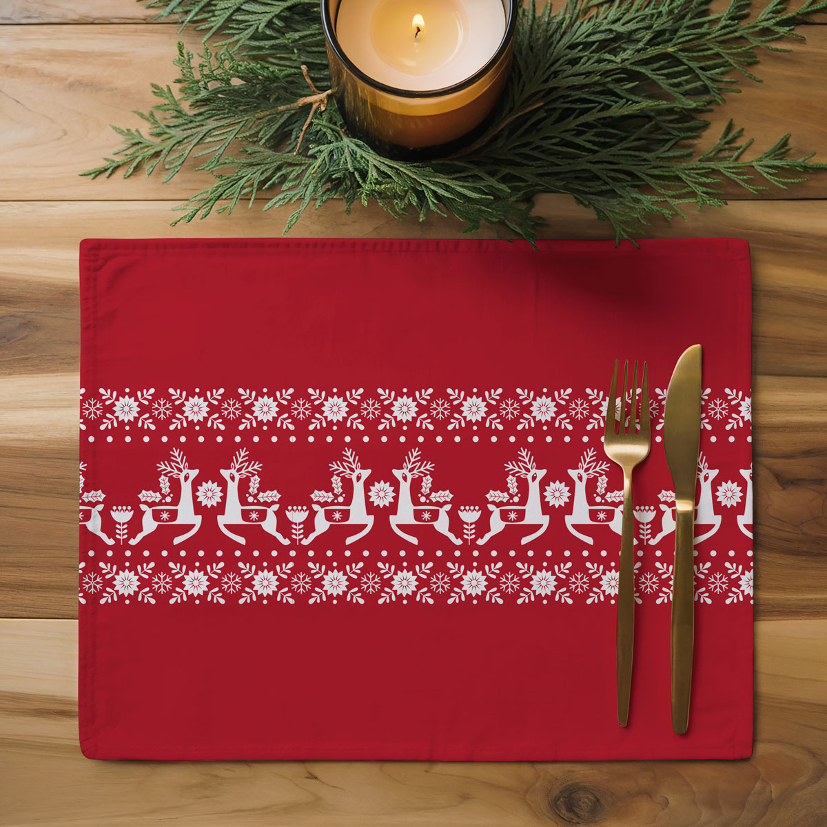 Podkładka świąteczna w intensywnej czerwieni z uroczym motywem reniferów i białym, skandynawskim ornamentem. Idealna na świąteczne nakrycie stołu — dodaje przytulności, stylu i wyjątkowego klimatu.