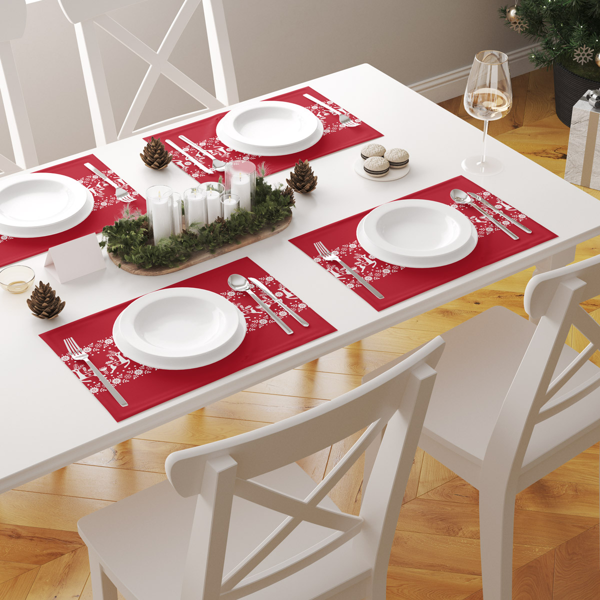 Świąteczna podkładka stołowa w intensywnym czerwonym kolorze to wyjątkowy element dekoracyjny, który wnosi na stół magię zimowych świąt. Biały ornament inspirowany skandynawskim wzornictwem oraz motyw reniferów tworzą niepowtarzalny, radosny klimat.