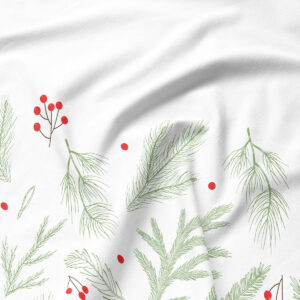 Elegancka podkładka na stół w świątecznym stylu – biała, ozdobiona zielonymi gałązkami i czerwonymi jagodami. Delikatny, naturalny wzór wprowadza do wnętrza świeżość i zimowy klimat.