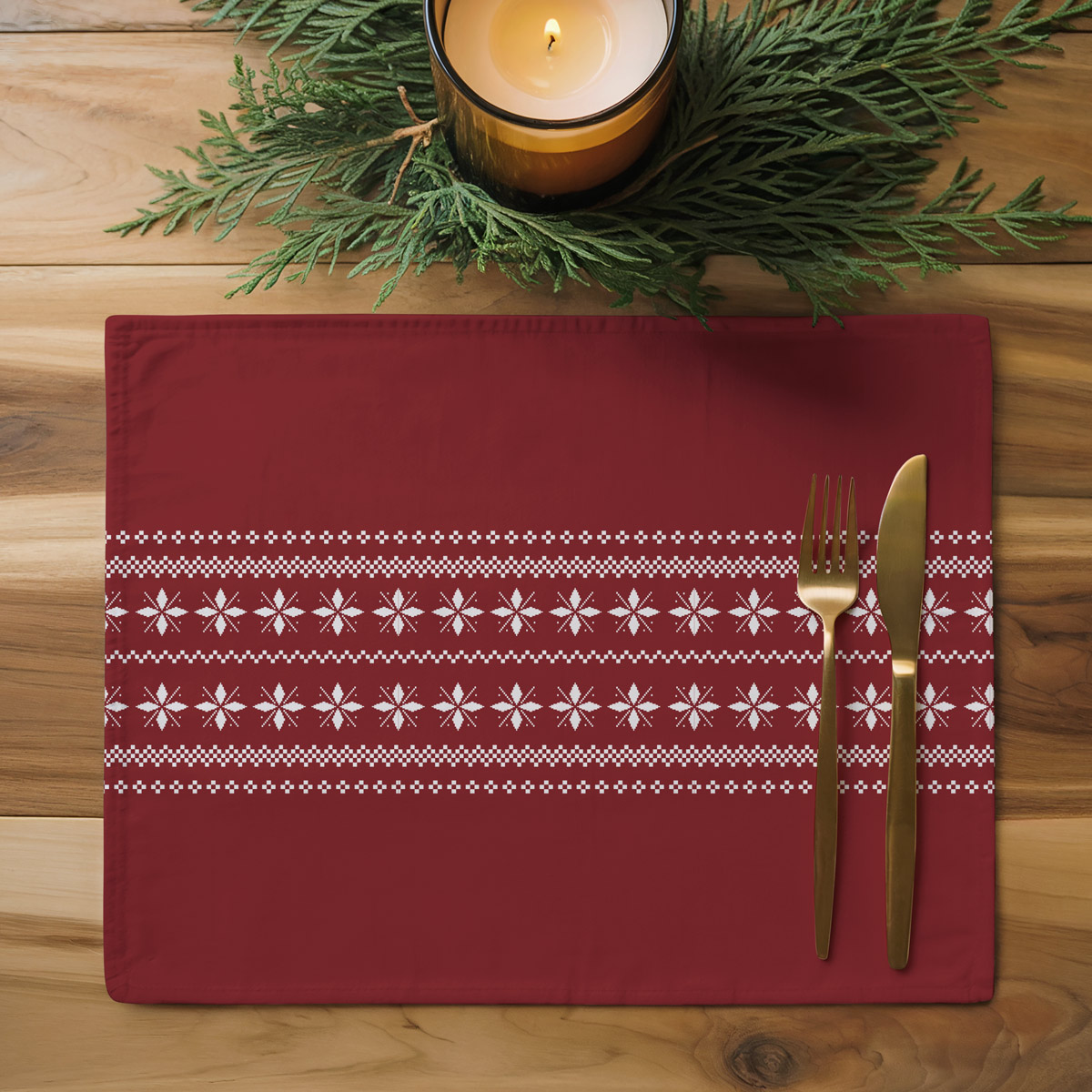 Idealna podkładka w głębokim bordowym kolorze z jasnym skandynawskim wzorem. Trwała, elegancka i szyta na wymiar — świetnie podkreśla zimowy klimat wnętrza i chroni powierzchnię stołu.