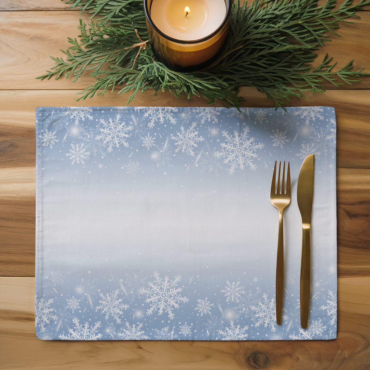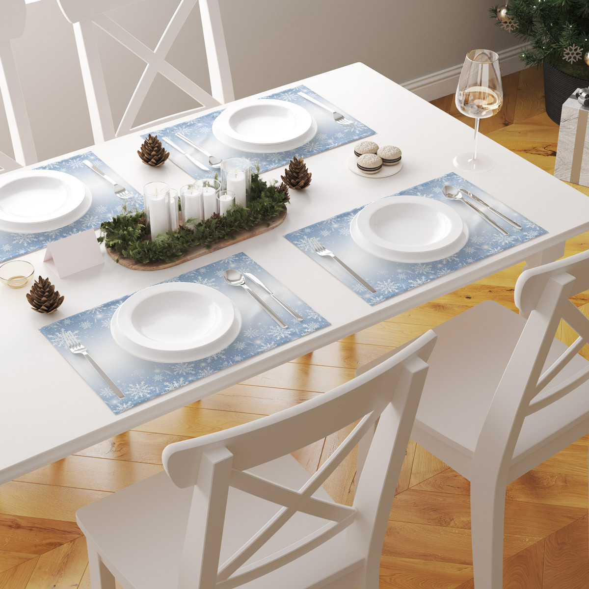 Świąteczna podkładka w delikatnym błękitnym kolorze, ozdobiona subtelnym wzorem białych śnieżynek. Idealna, aby dodać stołowi zimowy, elegancki klimat i wprowadzić nastrojową atmosferę świąt.