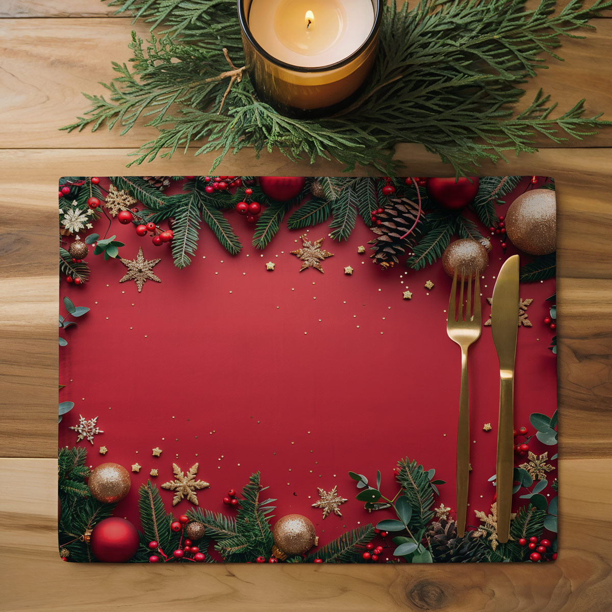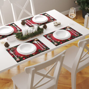 Elegancka świąteczna podkładka w intensywnej czerwieni, zdobiona bombkami, zielonymi gałązkami i złotymi śnieżynkami. Idealna do wprowadzenia ciepłej, bożonarodzeniowej atmosfery na stole.