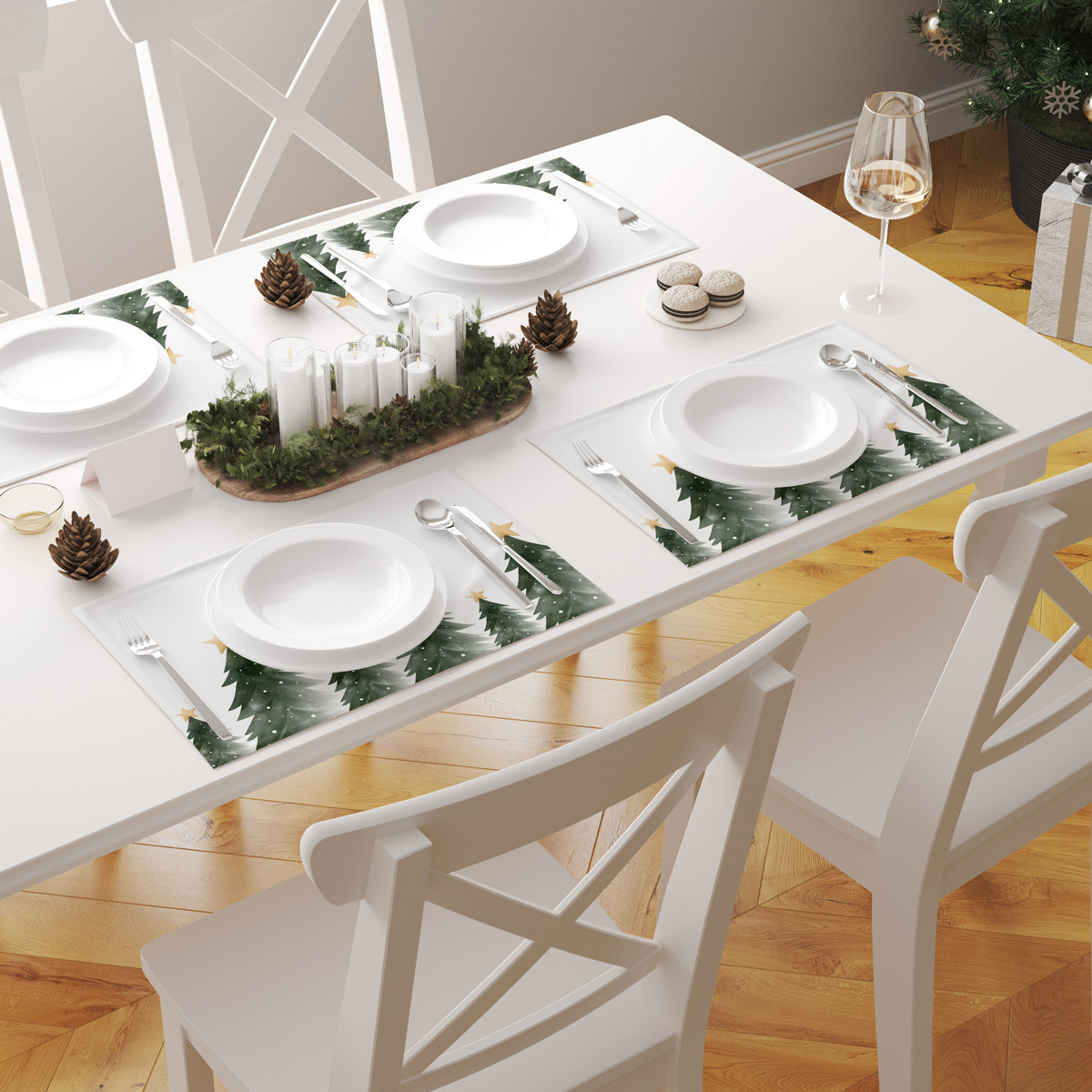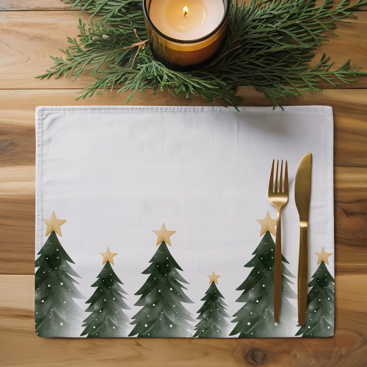 Eleganckie podkładki na stół z delikatnym motywem zielonych choinek i złotych gwiazd. Stylowy, nastrojowy wzór, który subtelnie ozdobi każde nakrycie.