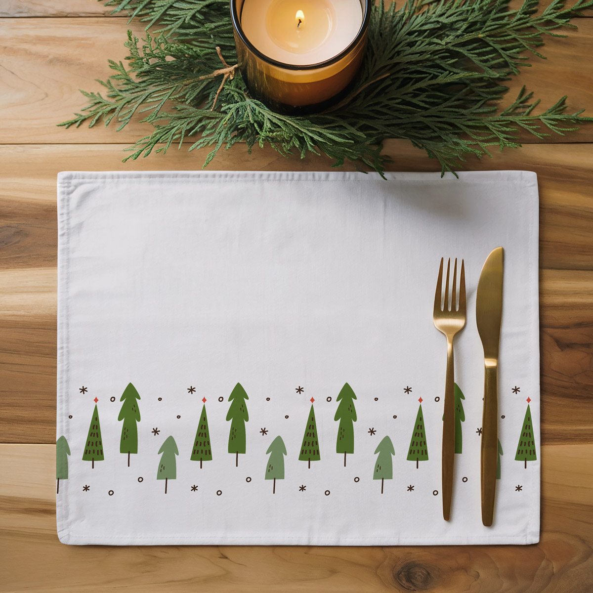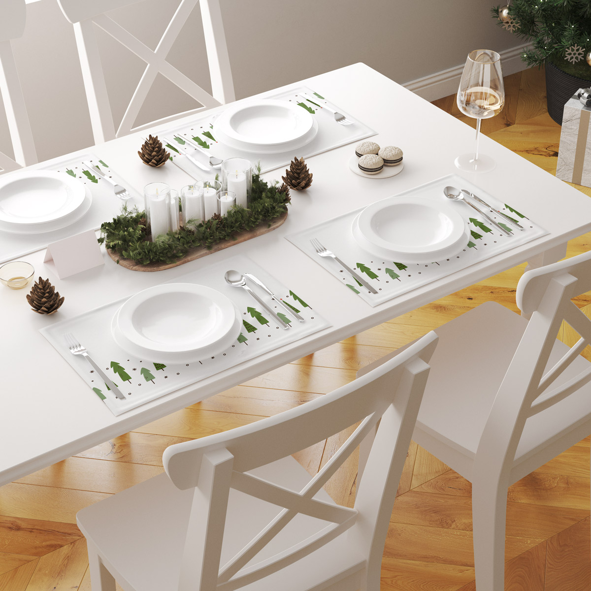 Podkładki na stół w białym kolorze z uroczym wzorem zielonych choinek. Subtelne, zimowe akcenty, które tworzą przytulną i świąteczną atmosferę w jadalni.