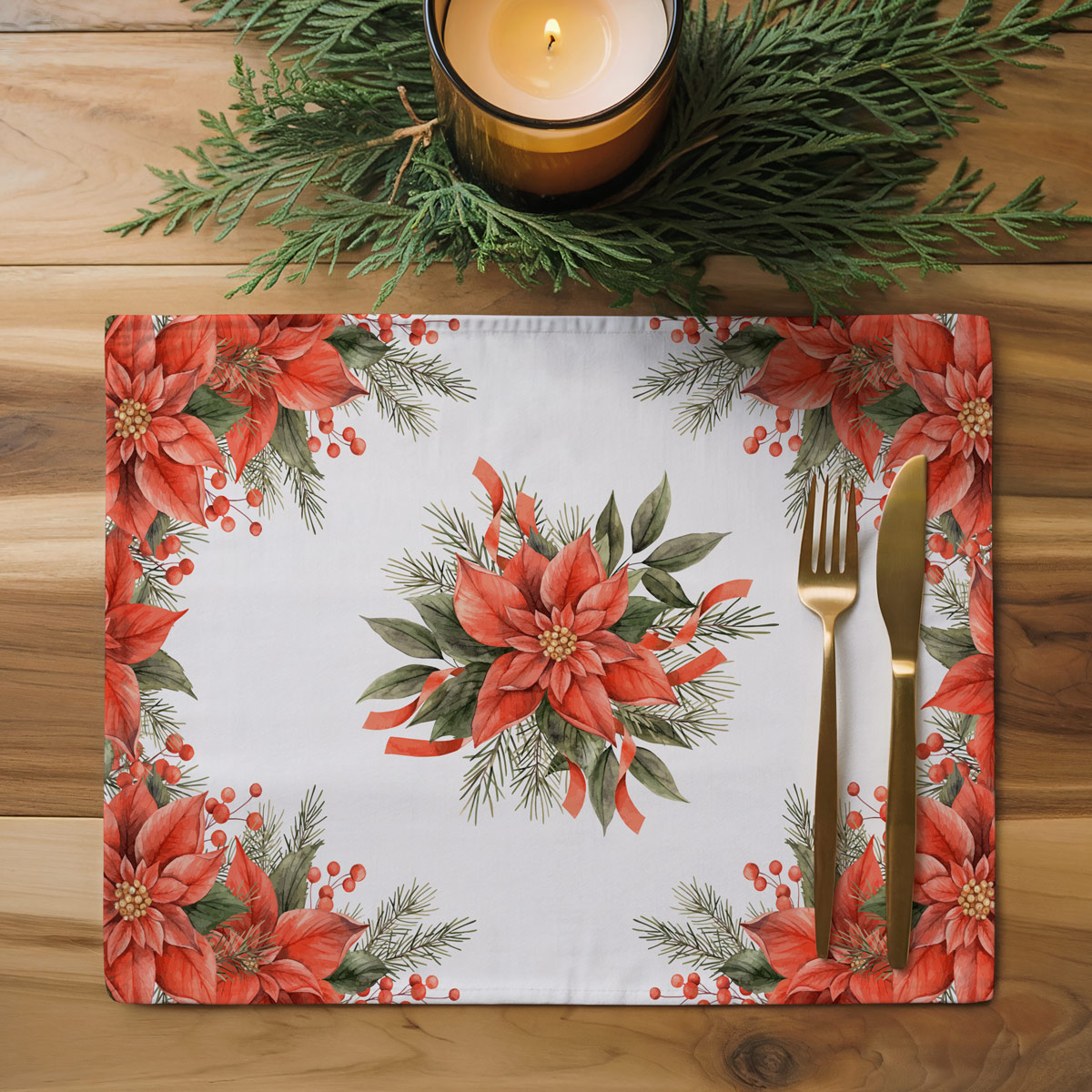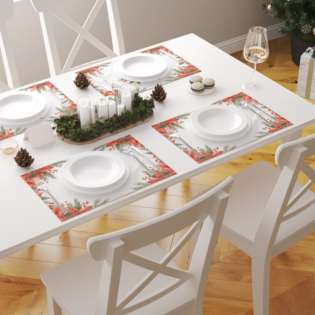 Podkładka świąteczna na stół – biały z czerwonymi poinsecjami i gałązkami – 2 szt.
