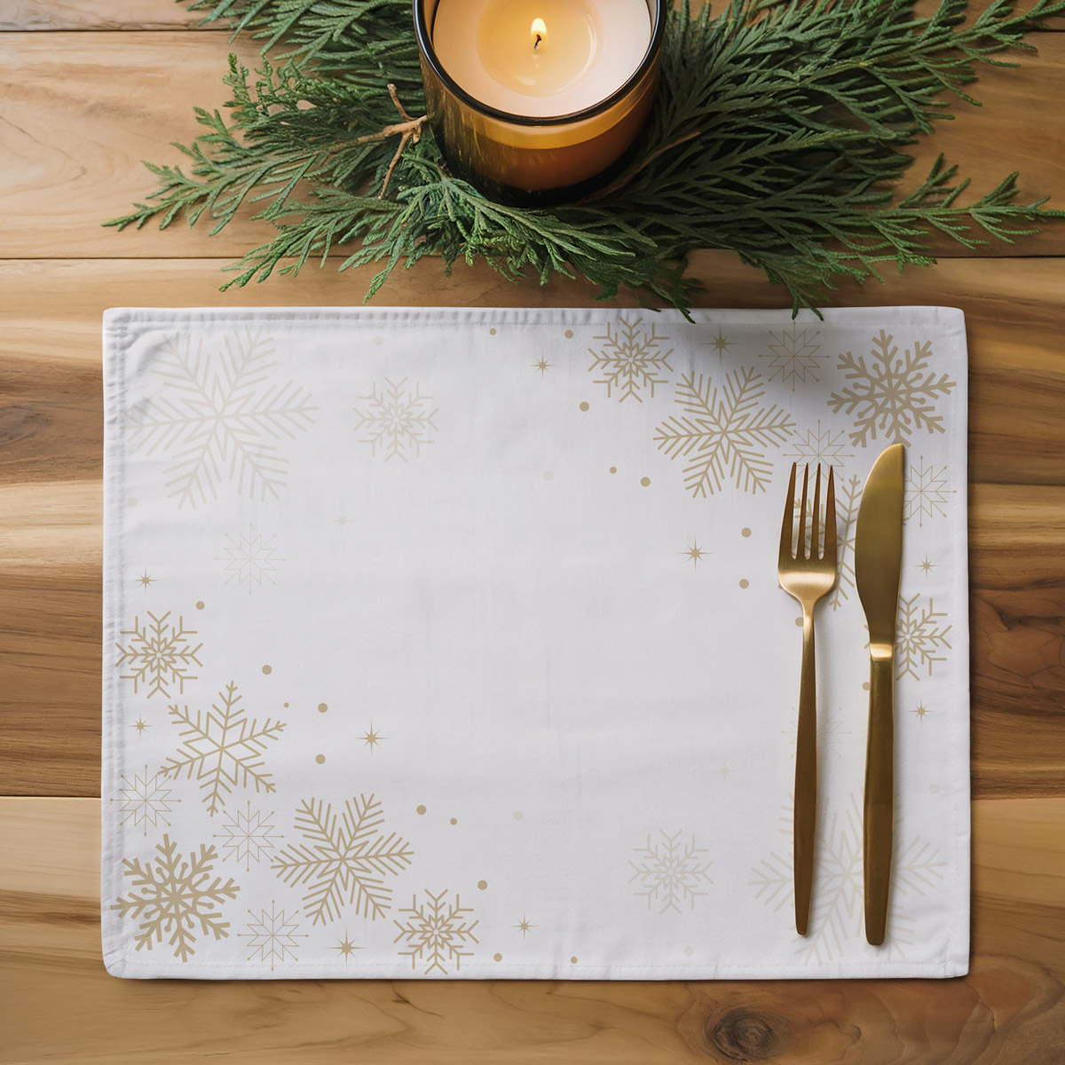Elegancka świąteczna podkładka na stół w białym kolorze, ozdobiona delikatnymi złotymi śnieżynkami. Subtelny, zimowy wzór tworzy efektowną dekorację, idealną na uroczyste nakrycie stołu podczas świąt.