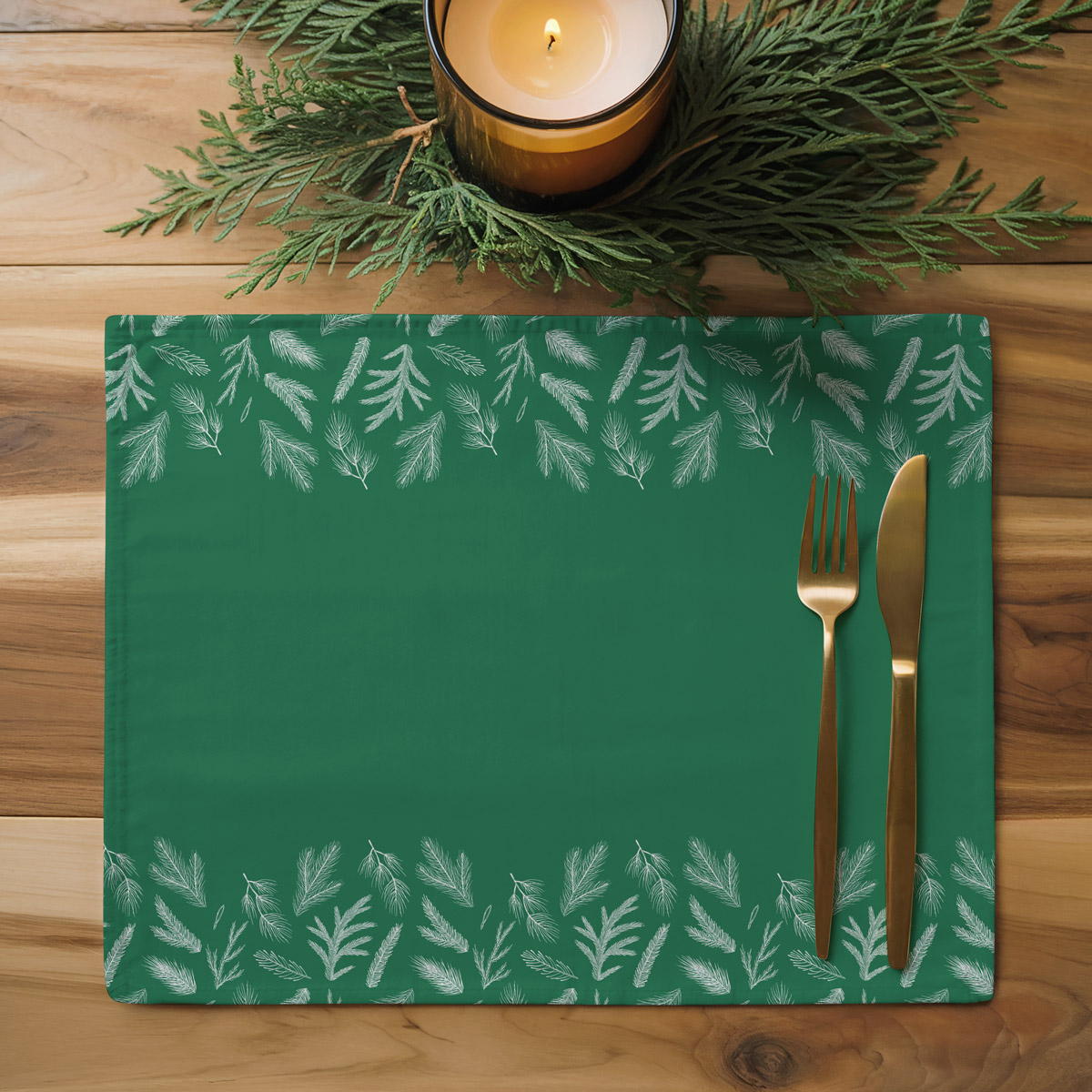 Elegancka podkładka świąteczna w kolorze butelkowej zieleni, ozdobiona subtelnym motywem białych gałązek iglastych. Idealna do stworzenia naturalnej, klimatycznej aranżacji stołu.