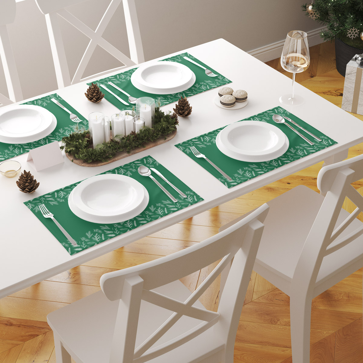 Stylowe podkładki stołowe w odcieniu butelkowej zieleni, zdobione delikatnym wzorem białych gałązek, to doskonały wybór na świąteczne i zimowe aranżacje. Wzór inspirowany naturą wprowadza do wnętrza ciepło oraz elegancję.