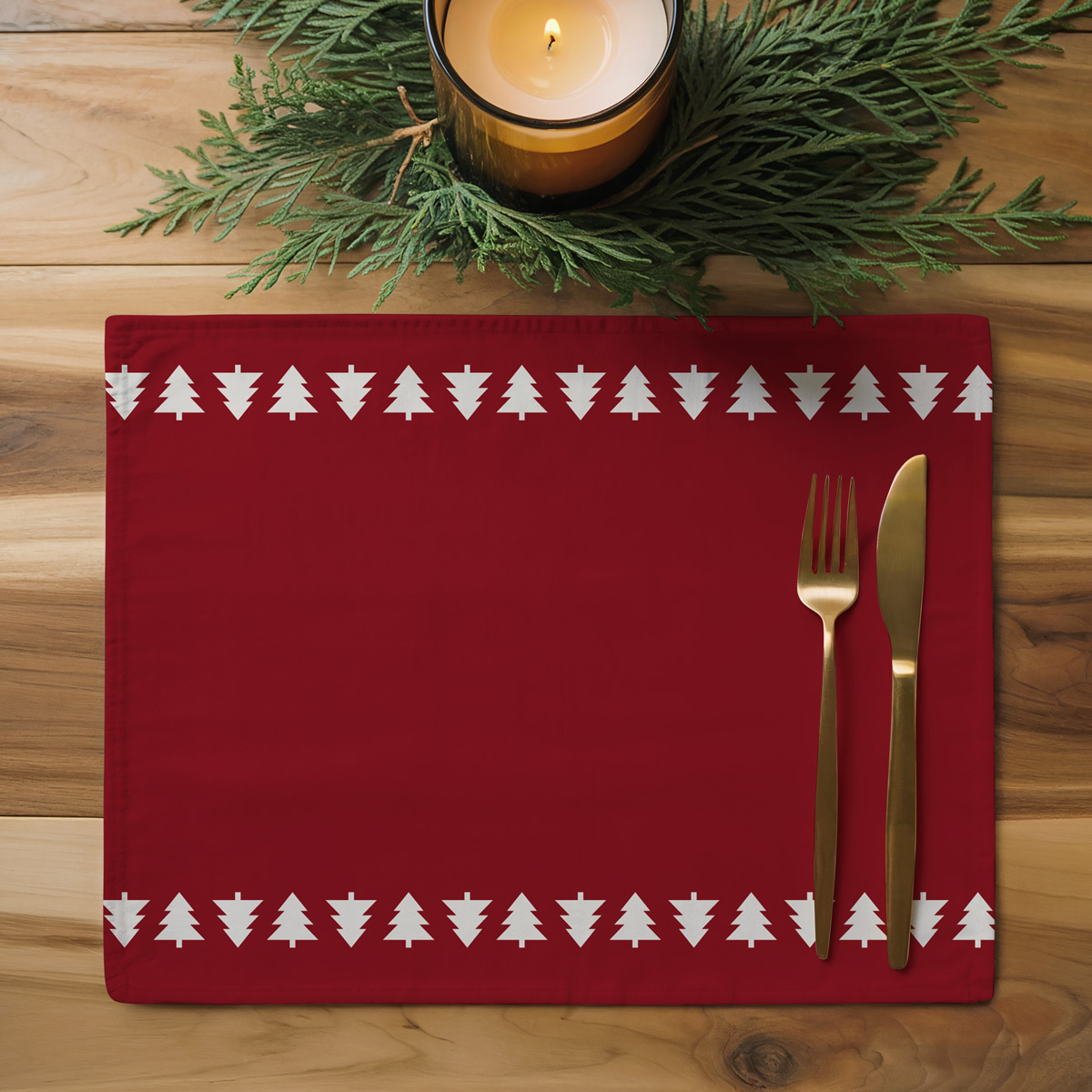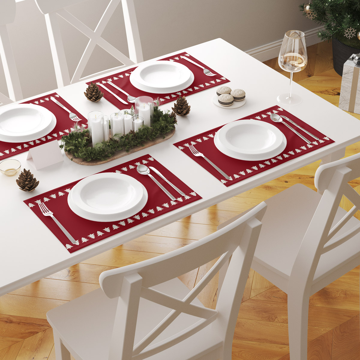 Elegancka podkładka na stół uszyta na wymiar. Głęboka czerwień i subtelny motyw drzewek przy krawędzi dodają nakryciu stylu i tworzą przytulny, zimowy klimat. Idealna do codziennego użytku i spotkań w gronie bliskich.