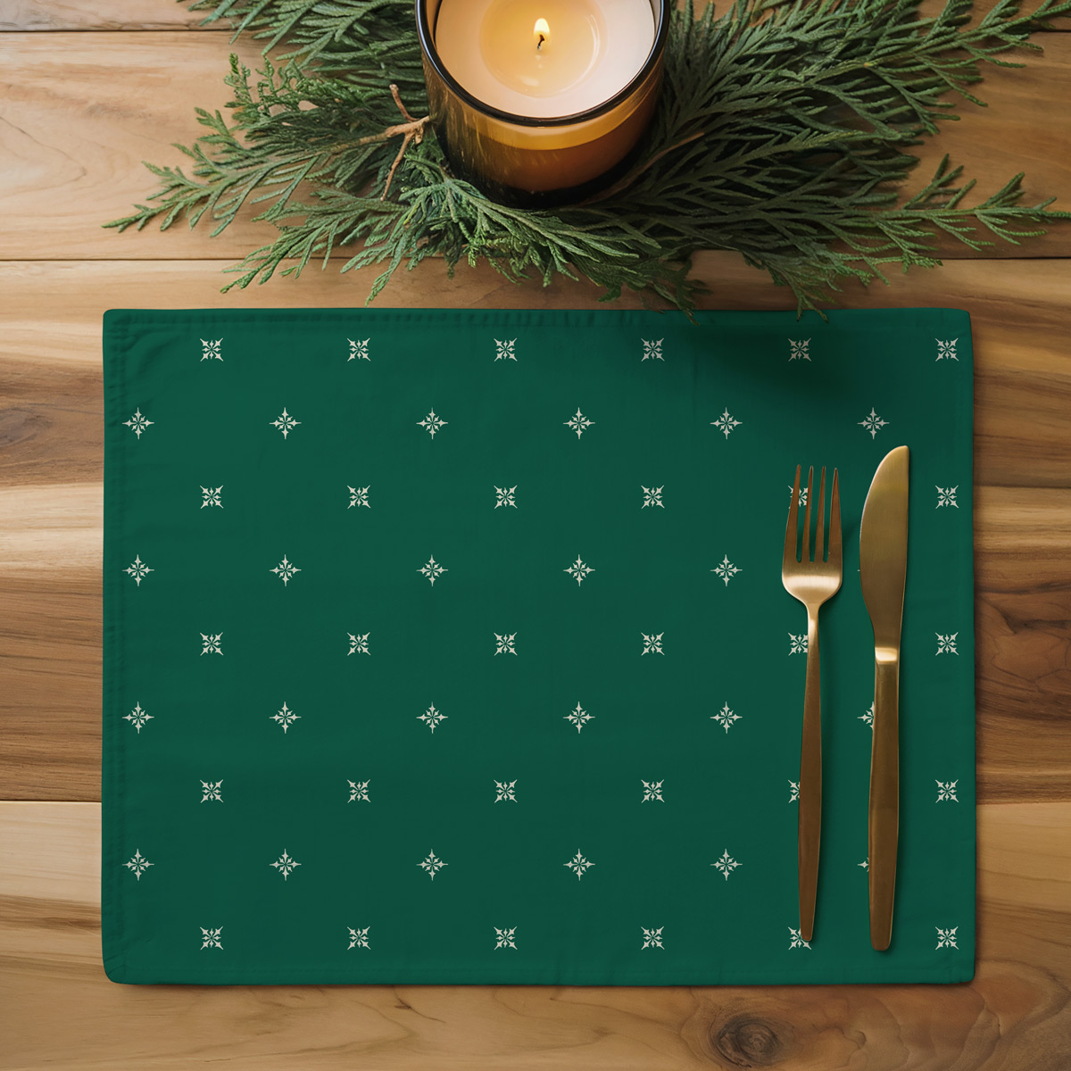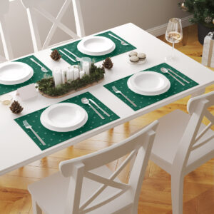 Elegancka podkładka w klasycznym, zielonym odcieniu z drobnym, subtelnym wzorem. Idealnie podkreśli aranżację stołu w sezonie zimowym. Dostępna na wymiar, starannie uszyta i trwała — świetna zarówno do codziennych, jak i odświętnych nakryć.