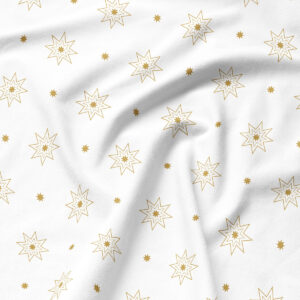 Elegancka świąteczna podkładka na stół w białym kolorze, ozdobiona subtelnym wzorem złotych gwiazd. Idealna do tworzenia jasnych, nastrojowych i pełnych blasku aranżacji świątecznych.