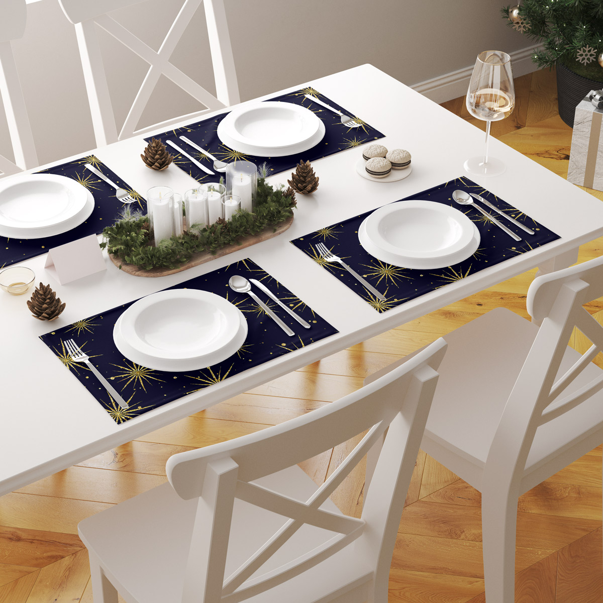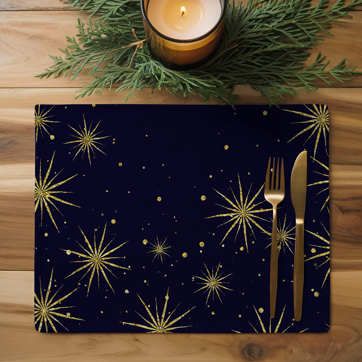 Elegancka świąteczna podkładka w głębokim granacie, ozdobiona złotymi gwiazdami i subtelnym blaskiem drobinek. Idealna, aby dodać stołowej aranżacji wyjątkowego, świąteczno-noworocznego charakteru.