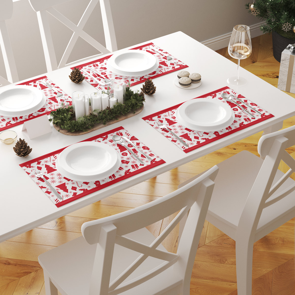 Dekoracyjna podkładka świąteczna w białej tonacji z czerwonymi ikonami zimowych symboli. Radosny i wyrazisty wzór, który dodaje stołowej aranżacji świątecznego nastroju.