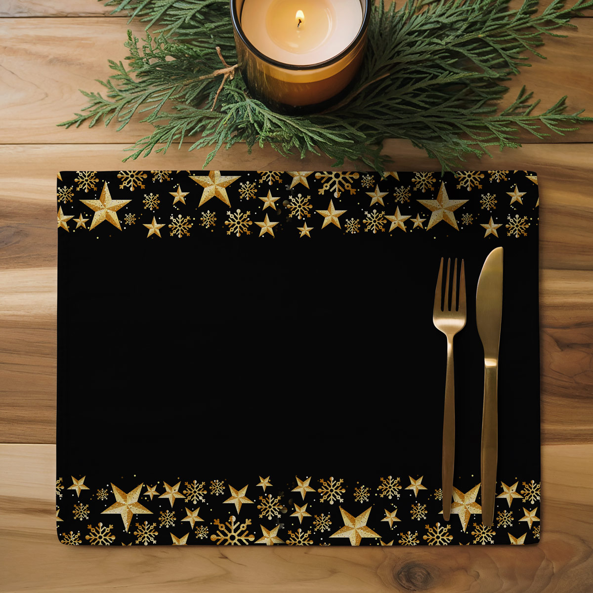 Elegancka świąteczna podkładka w czarnym kolorze, ozdobiona złotymi gwiazdkami i delikatnymi śnieżynkami. Wprowadza luksusowy, świąteczny klimat do każdej aranżacji stołu.