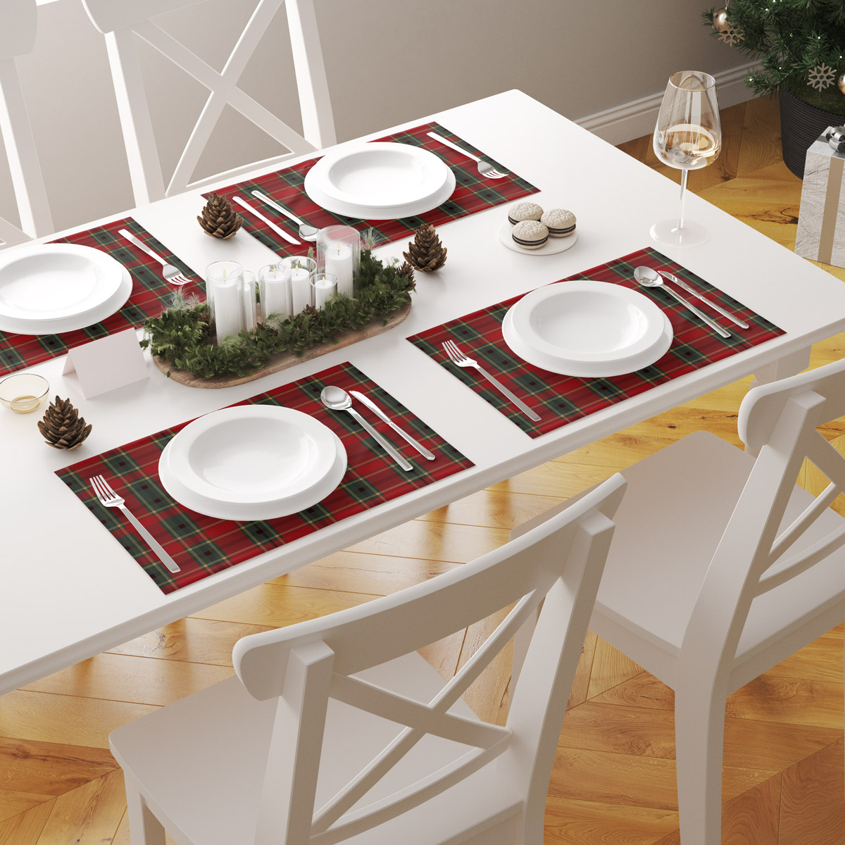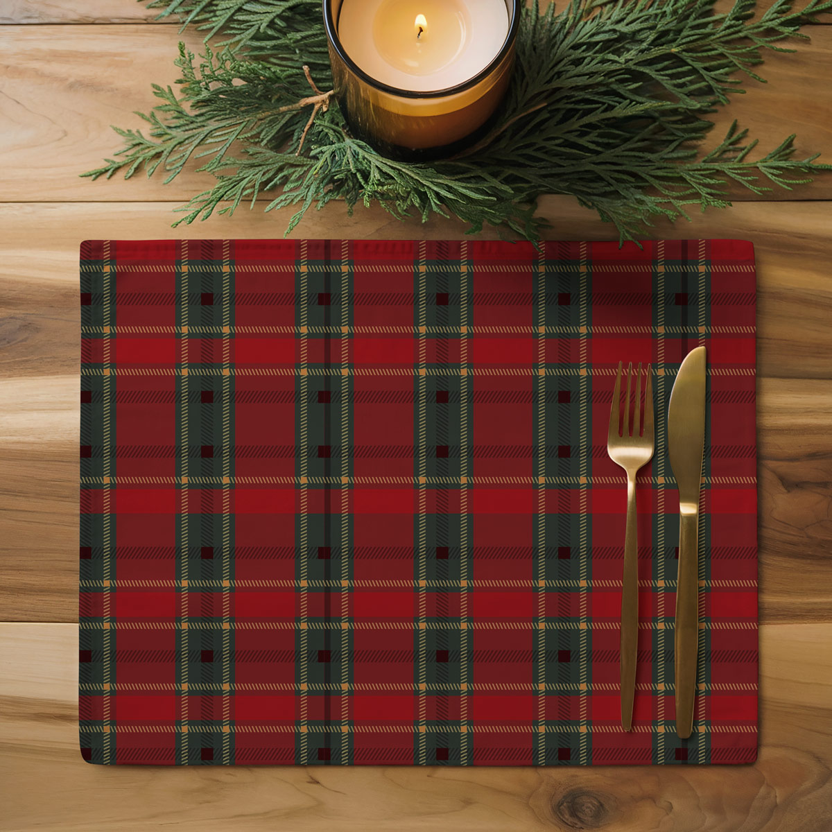 Podkładki na stół w klasycznej czerwonej kracie szkockiej z zielonym akcentem. Świąteczny, elegancki wzór, który dodaje uroku i ciepła każdemu nakryciu stołu.