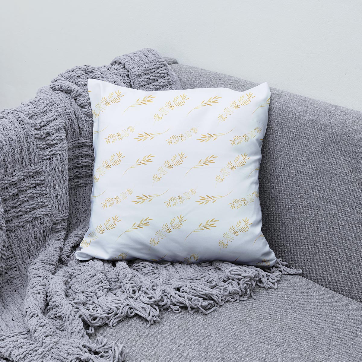 Klasyczny, jasny materiał z rozmieszczonymi drobnymi, złotymi gałązkami tworzy lekki i elegancki wzór, który pasuje do różnych stylów aranżacji. Dzięki subtelnemu połyskowi złotego motywu poduszka nadaje wnętrzu wyrafinowanego charakteru, nie przytłaczając przestrzeni.
