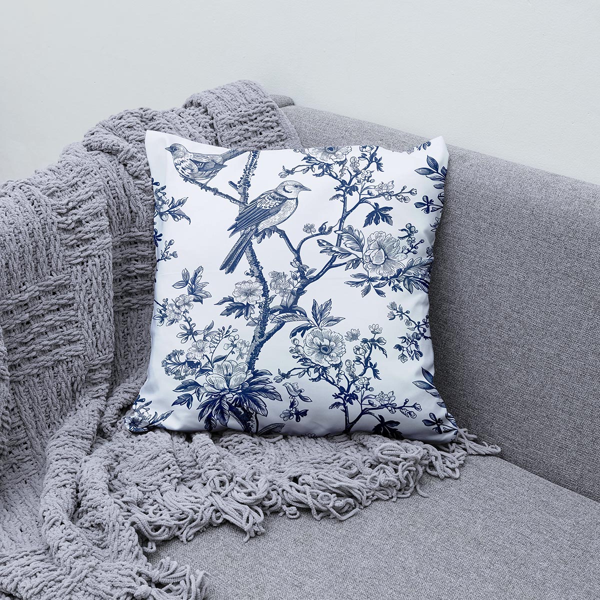 Biała poduszka dekoracyjna na kanapę – niebieskie ptaki na gałązkach