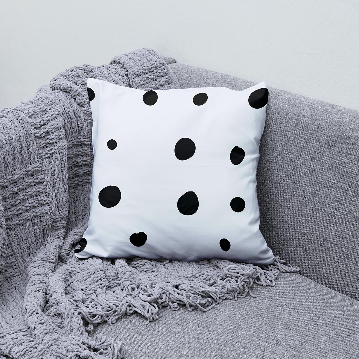 Graficzny wzór z nieregularnymi, czarnymi grochami doda wnętrzu nowoczesnego charakteru. To kompletna poduszka dekoracyjna z antyalergicznym wypełnieniem premium, przyjemna w dotyku i łatwa w utrzymaniu.
