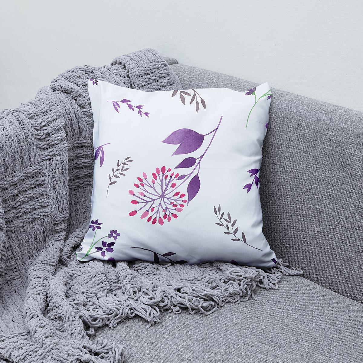 Ta poduszka dekoracyjna zachwyca subtelnym, malarskim wzorem akwarelowych gałązek i drobnych elementów przypominających serduszka. Jasne tło i pastelowe akcenty fioletu oraz różu tworzą łagodny, uniwersalny charakter idealny do sypialni i salonu.
