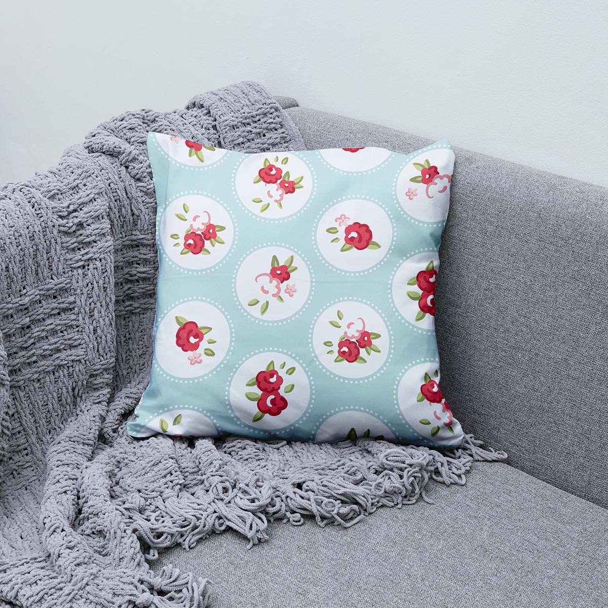 Miękka poduszka dekoracyjna z subtelnym motywem różowych kwiatuszków w okrągłych medalionach na miętowym tle. Doskonała do salonu i sypialni, doda przytulnego, dziewczęcego akcentu wnętrzu.